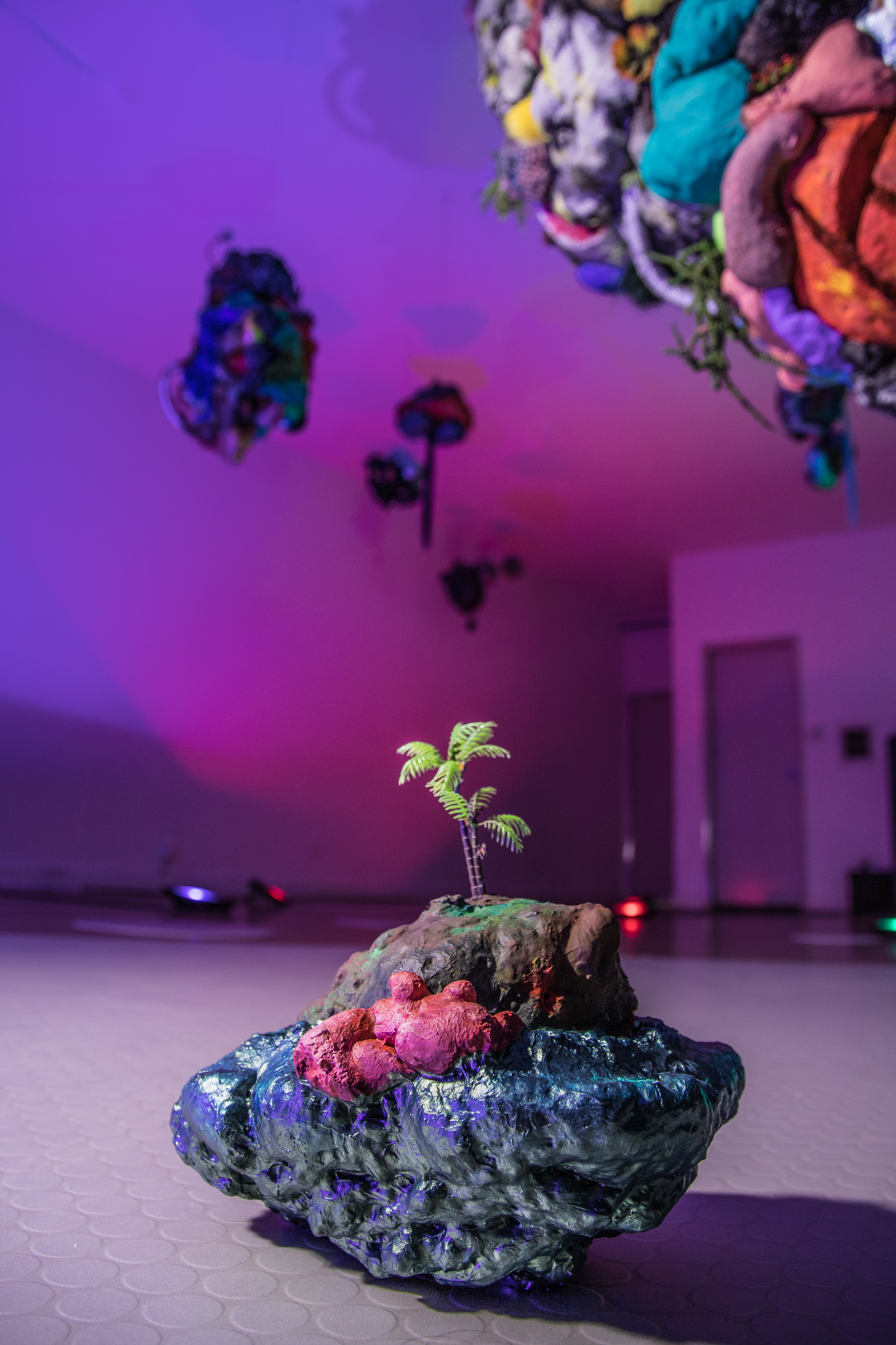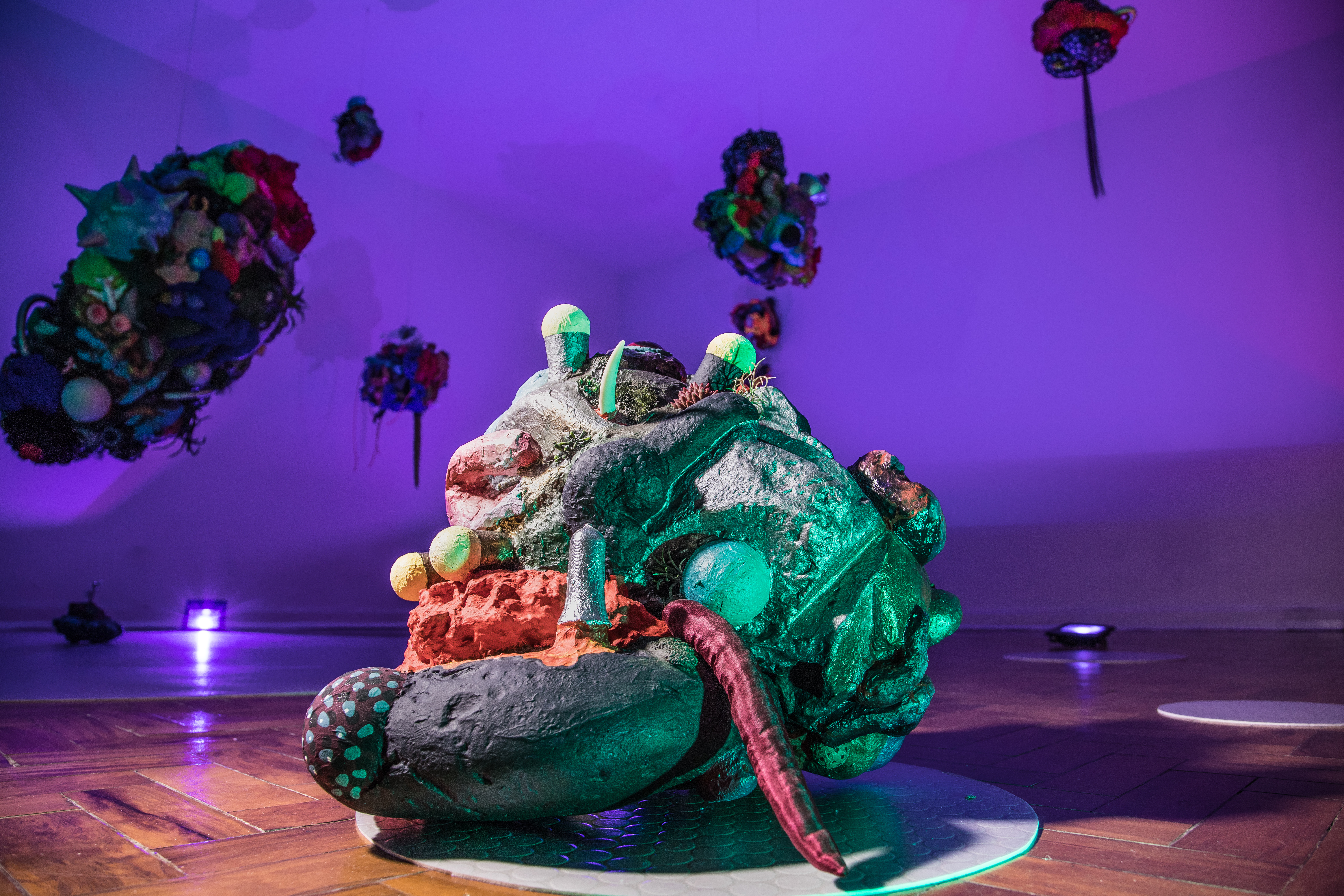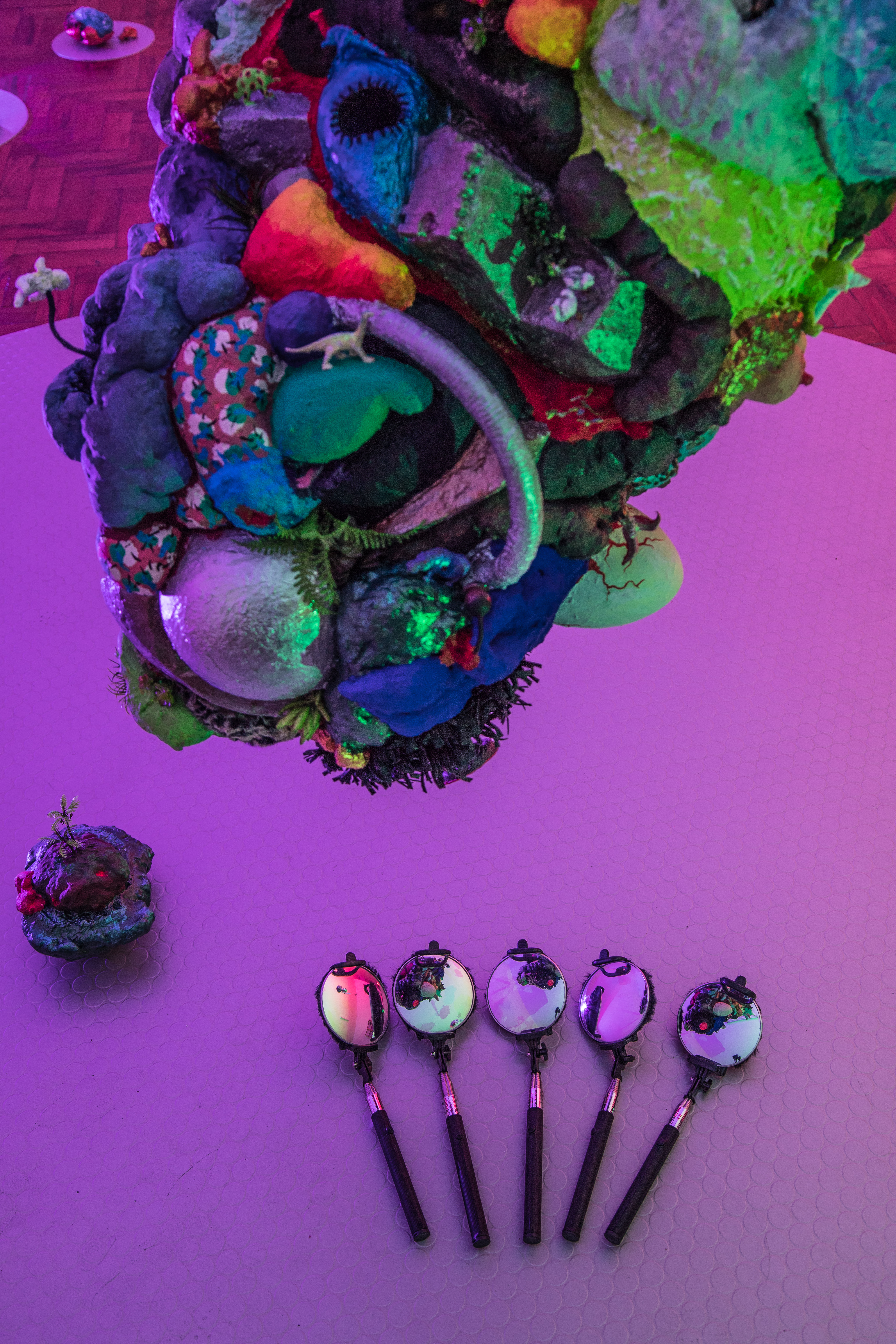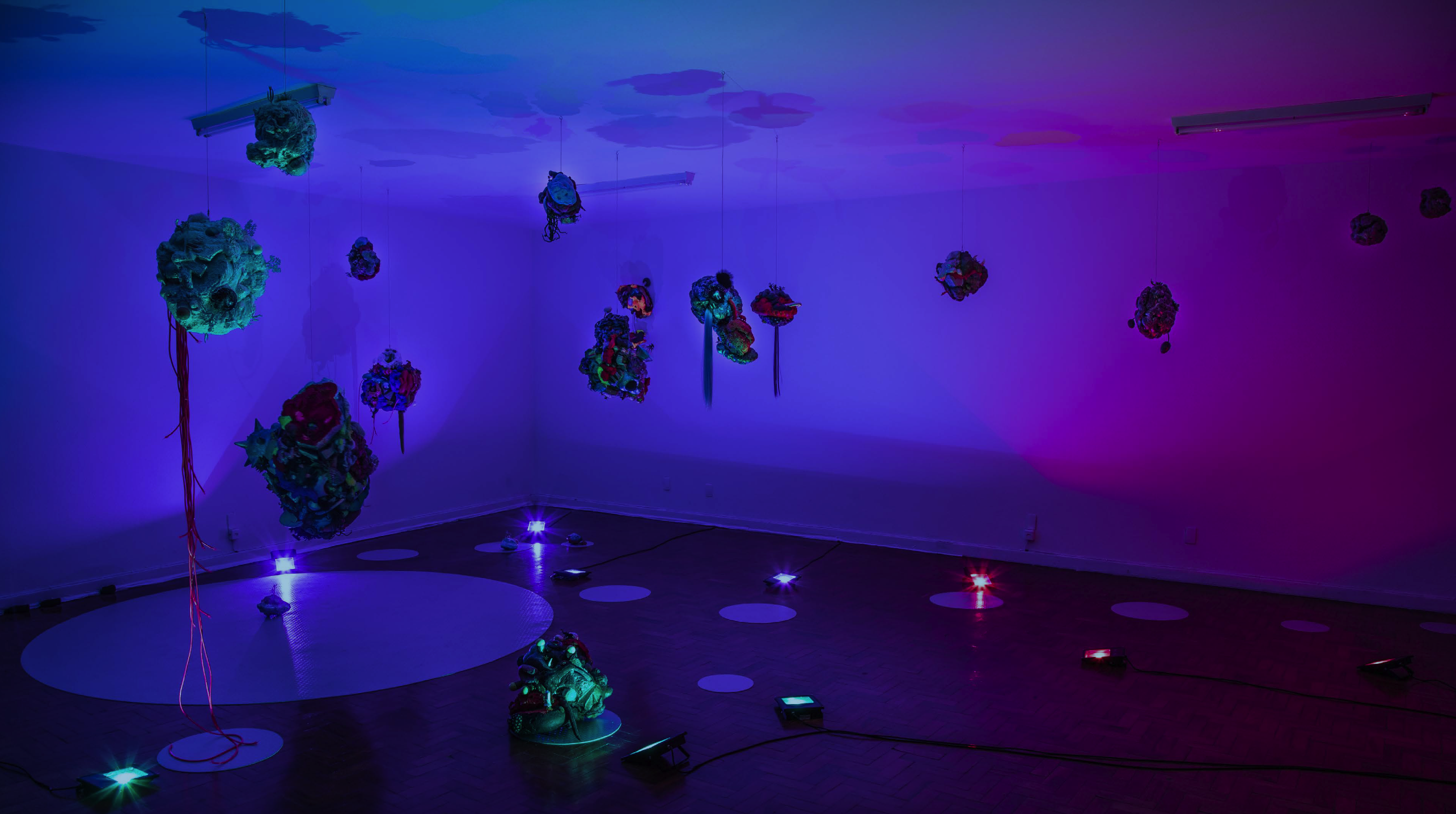 19 esculturas, espelhos de observação, tapetes circulares prateados, e iluminação de solo azul e lilás