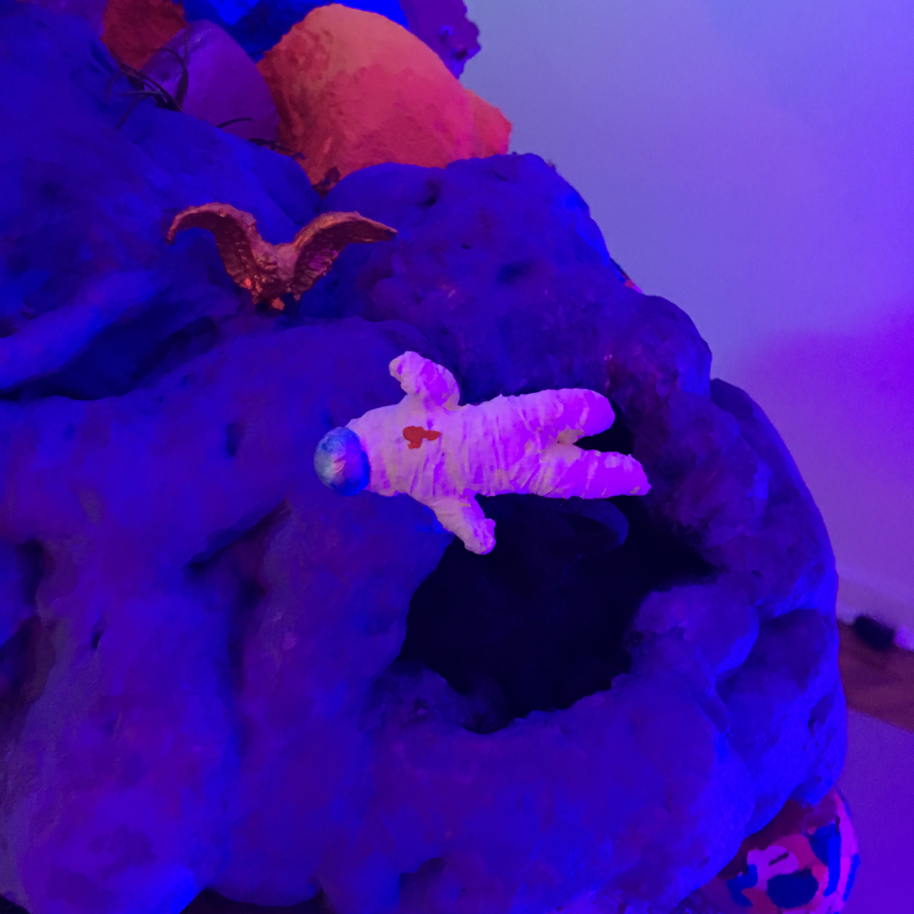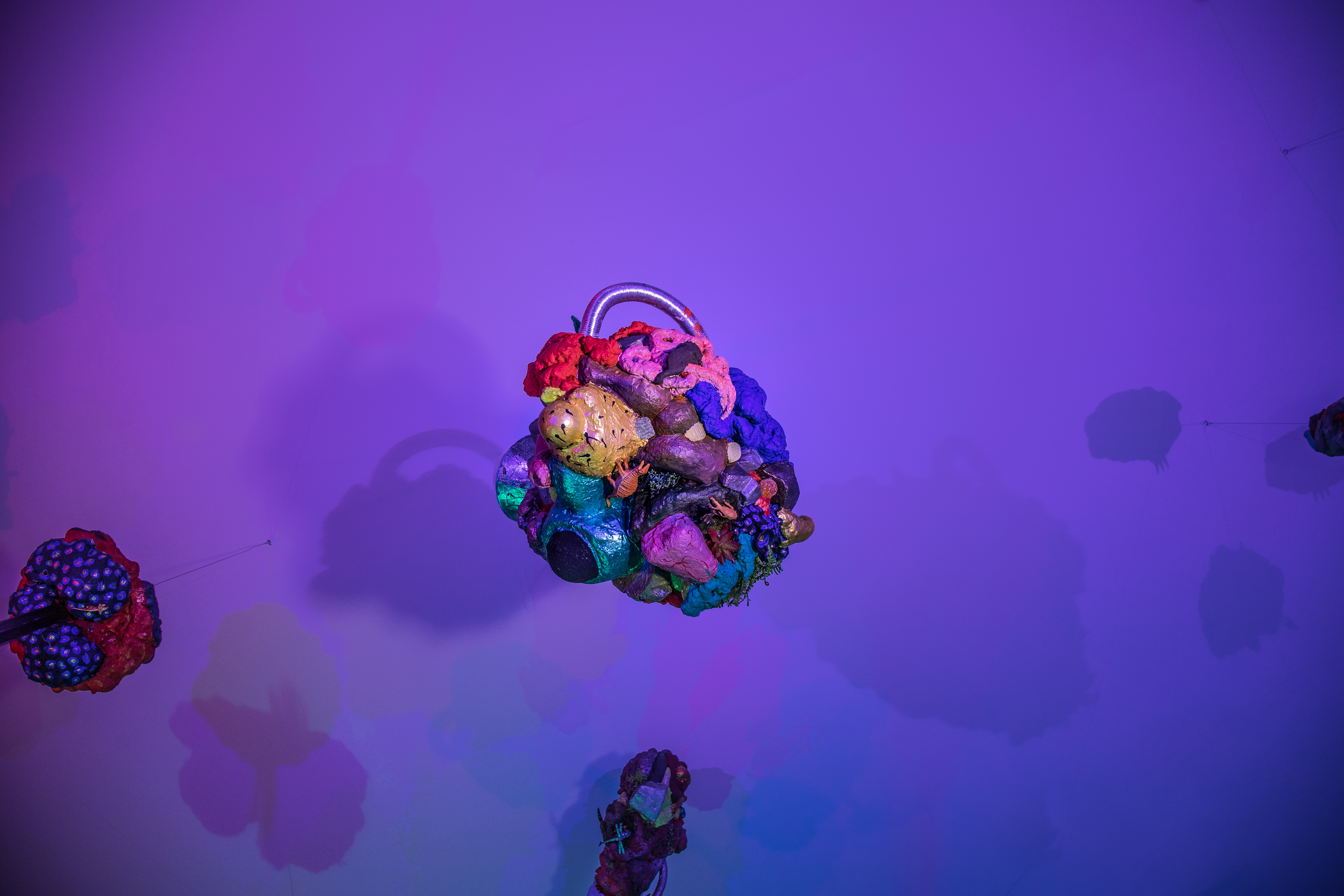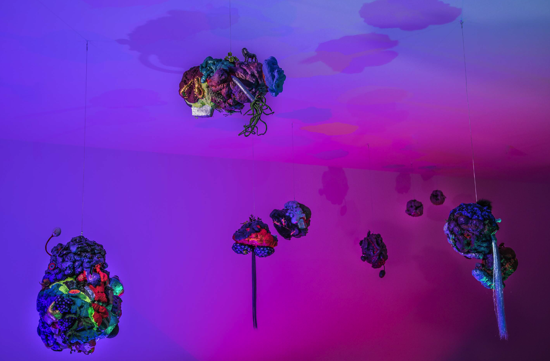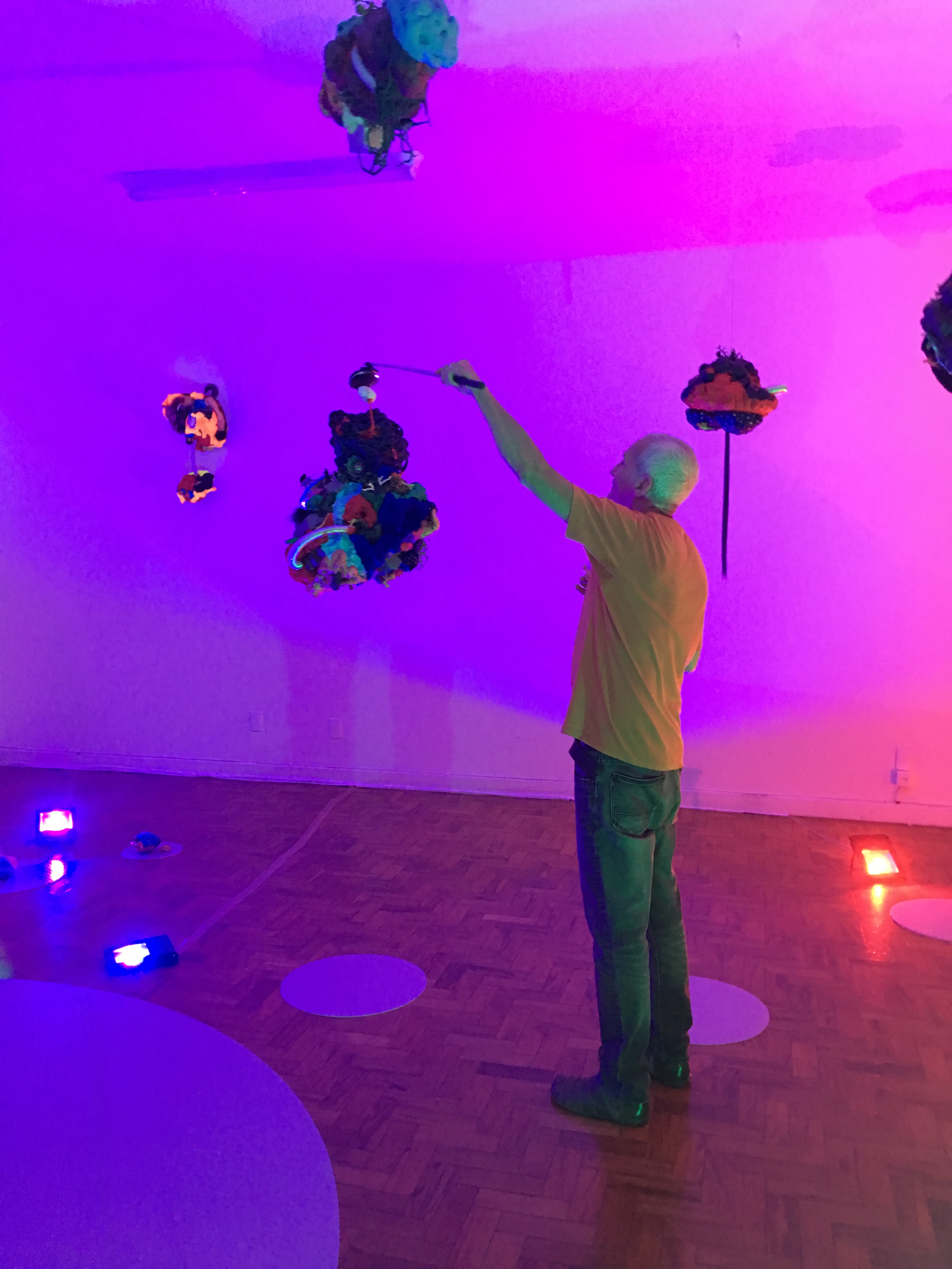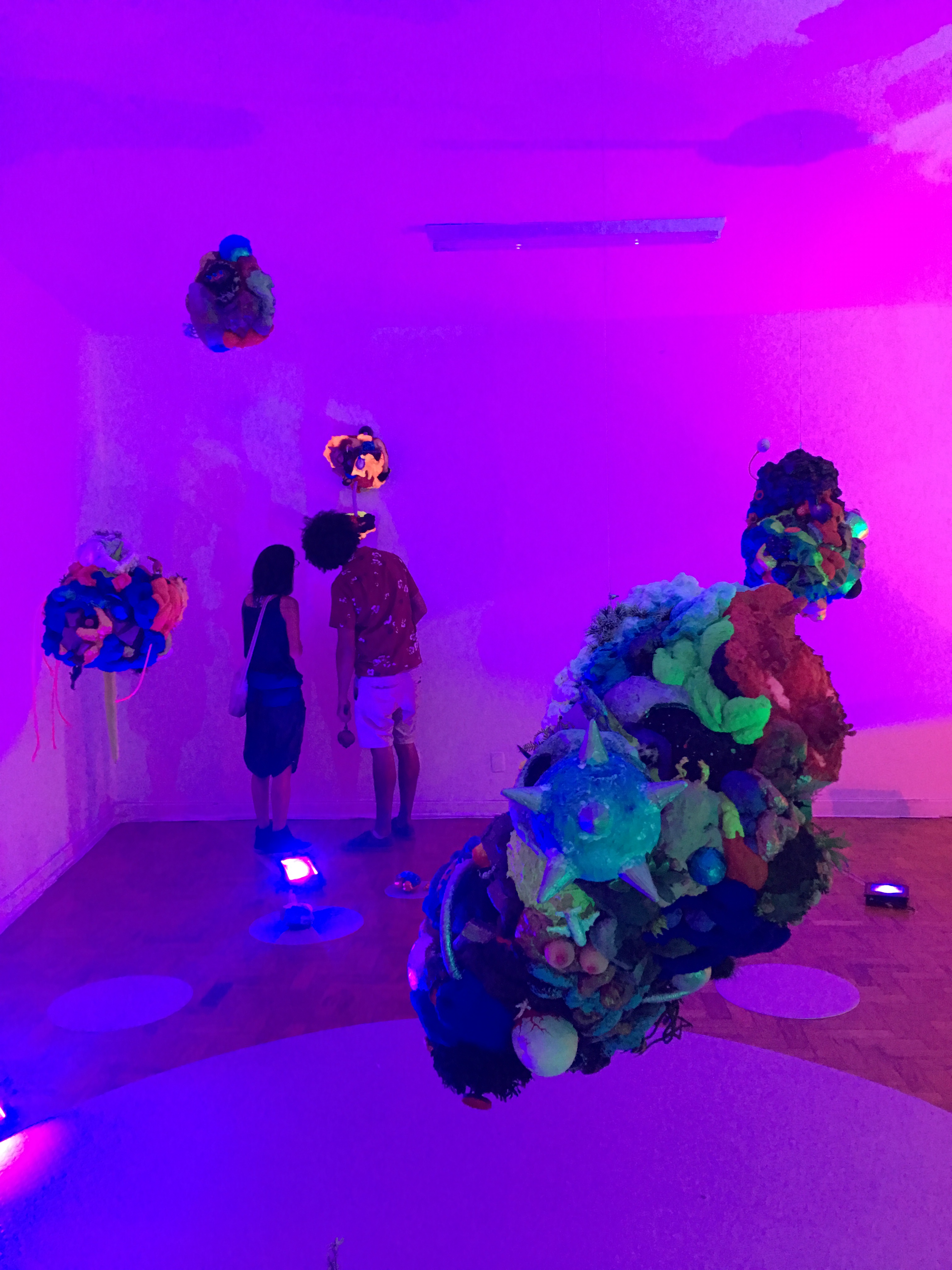 19 esculturas, espelhos de observação, tapetes circulares prateados, e iluminação de solo azul e lilás