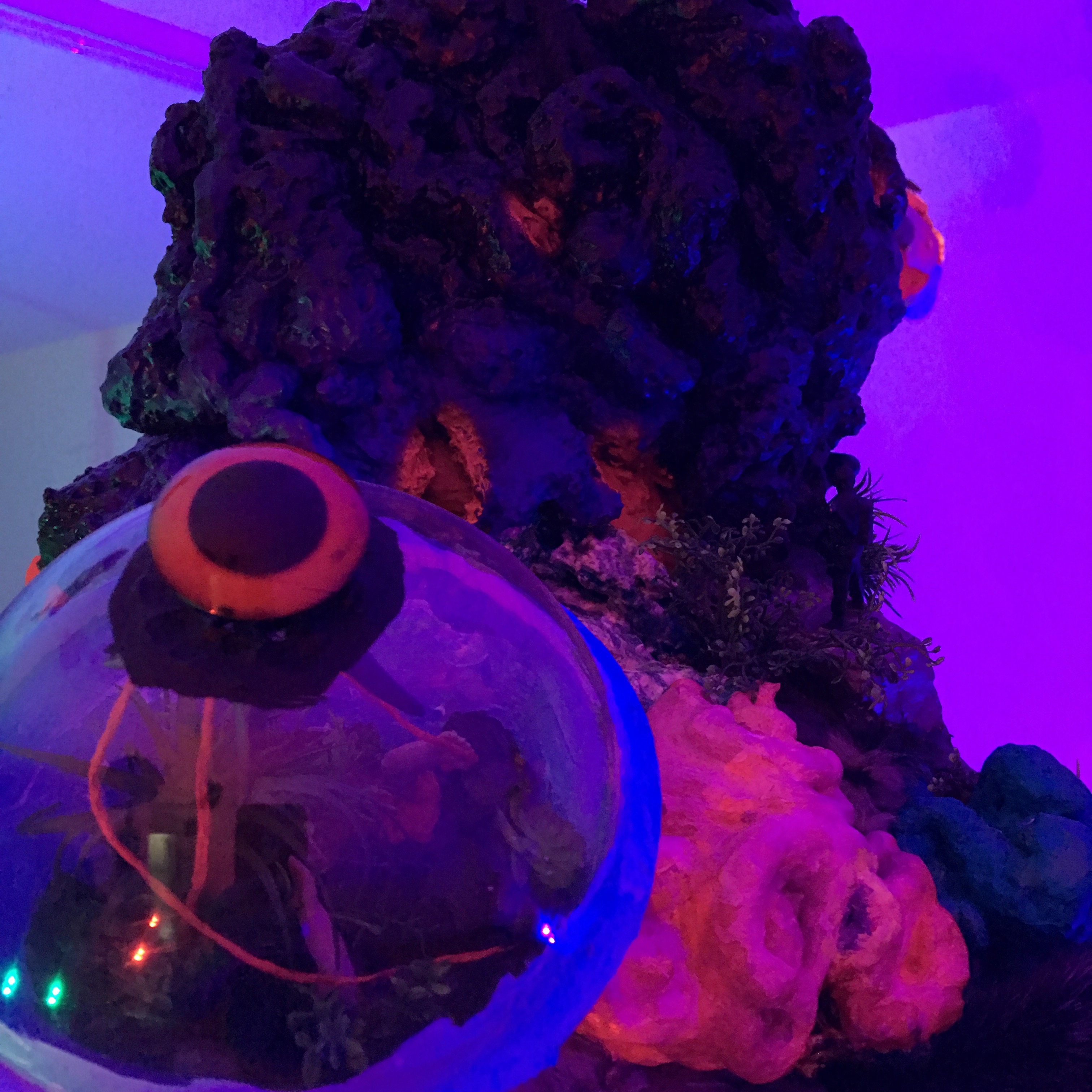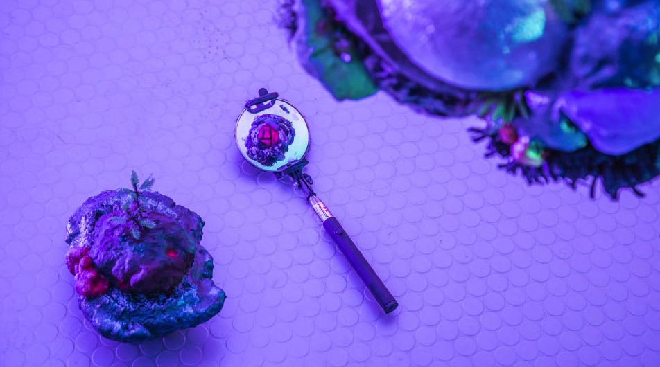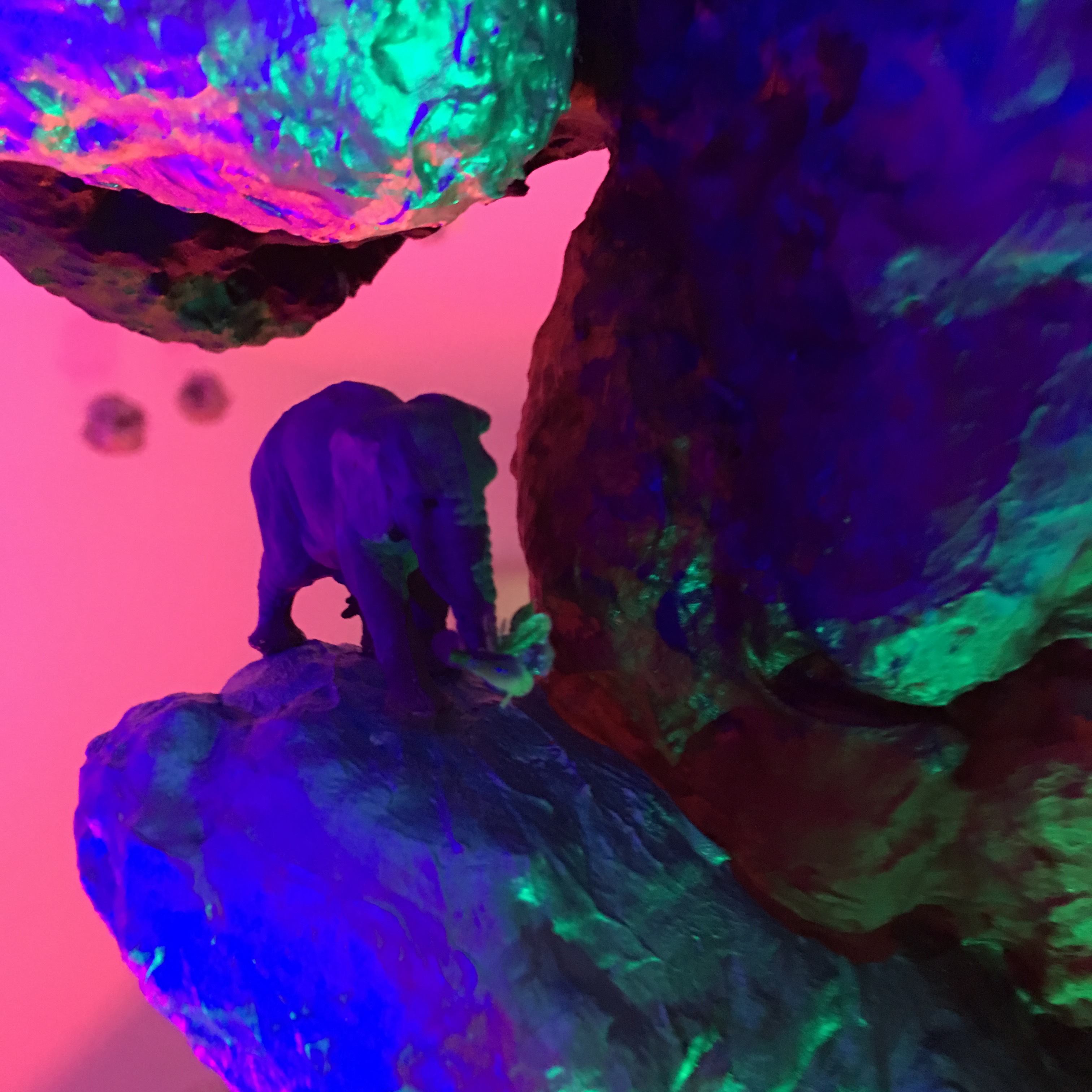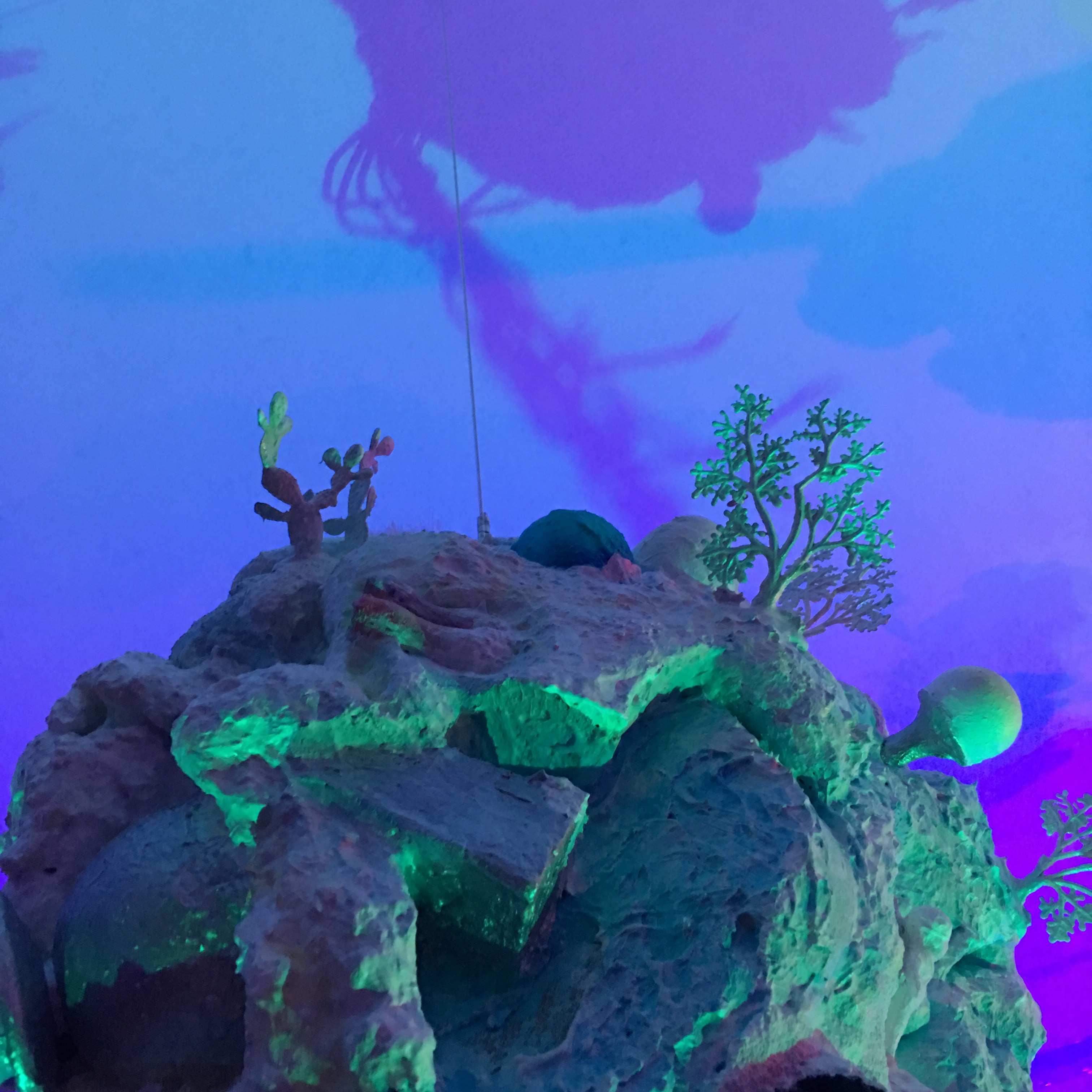 19 esculturas, espelhos de observação, tapetes circulares prateados, e iluminação de solo azul e lilás