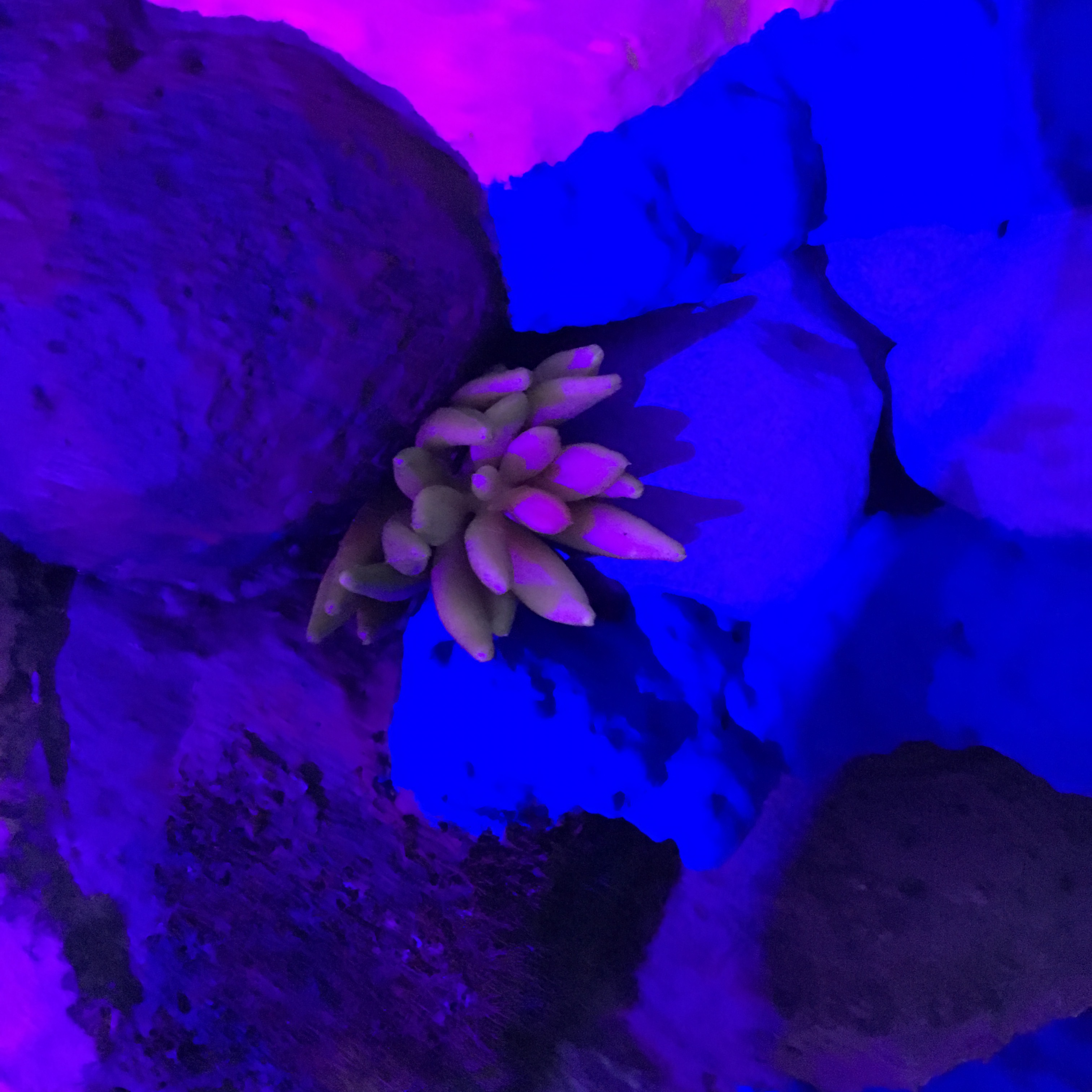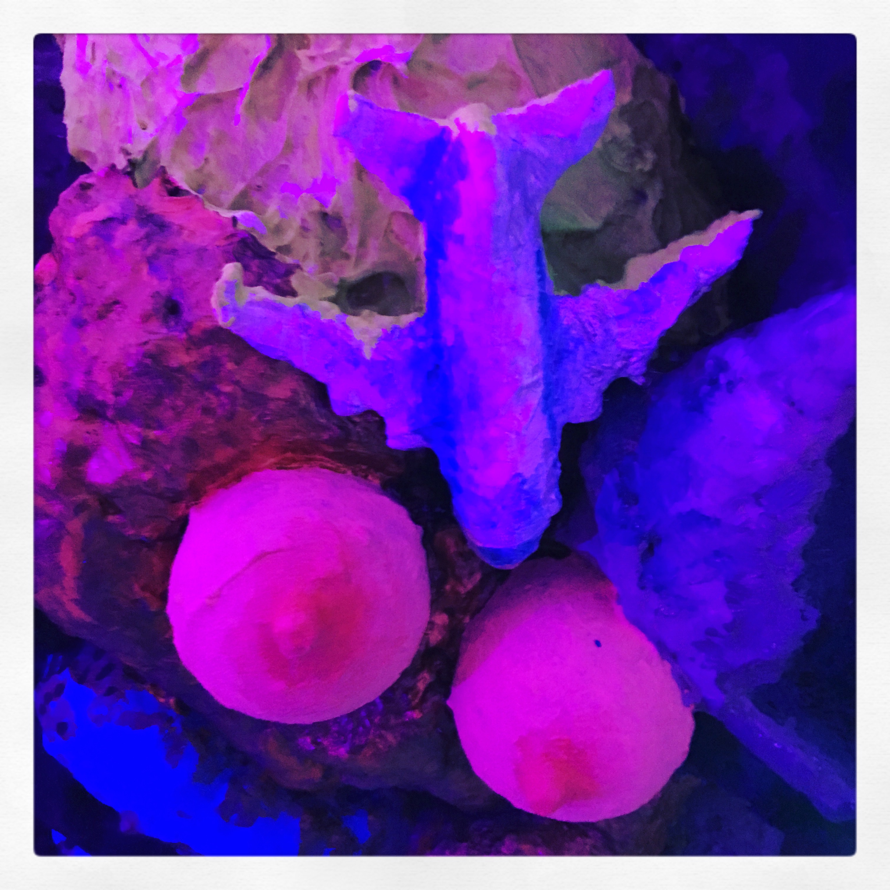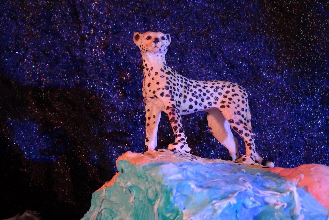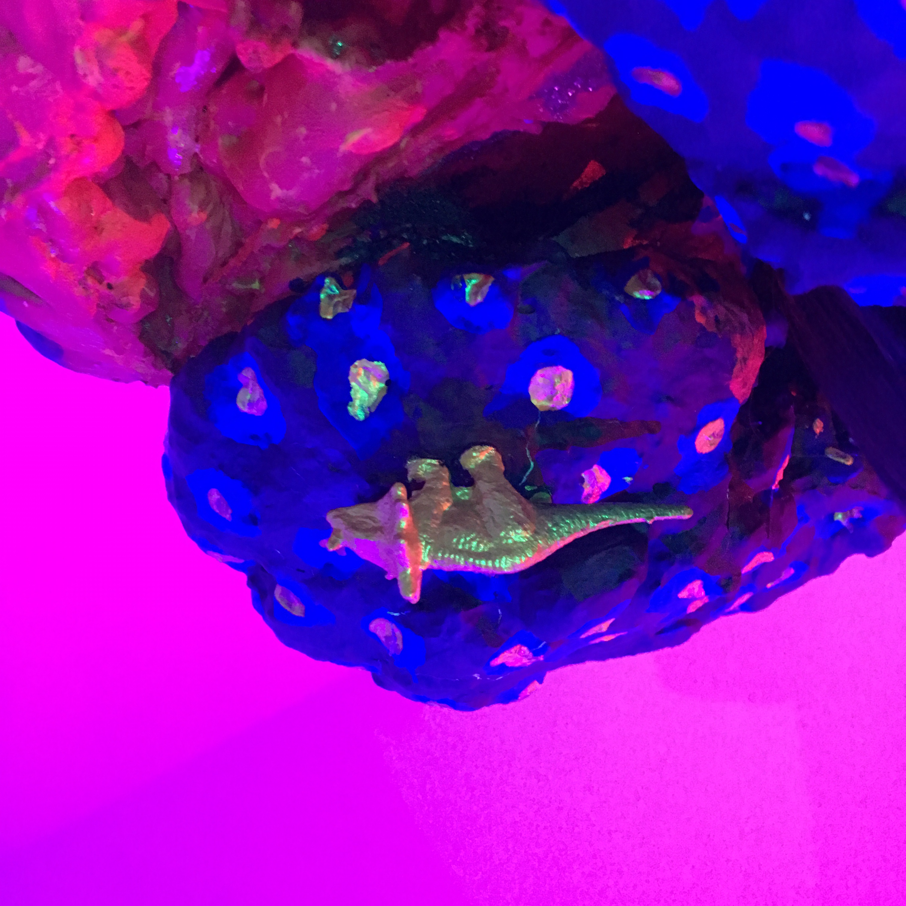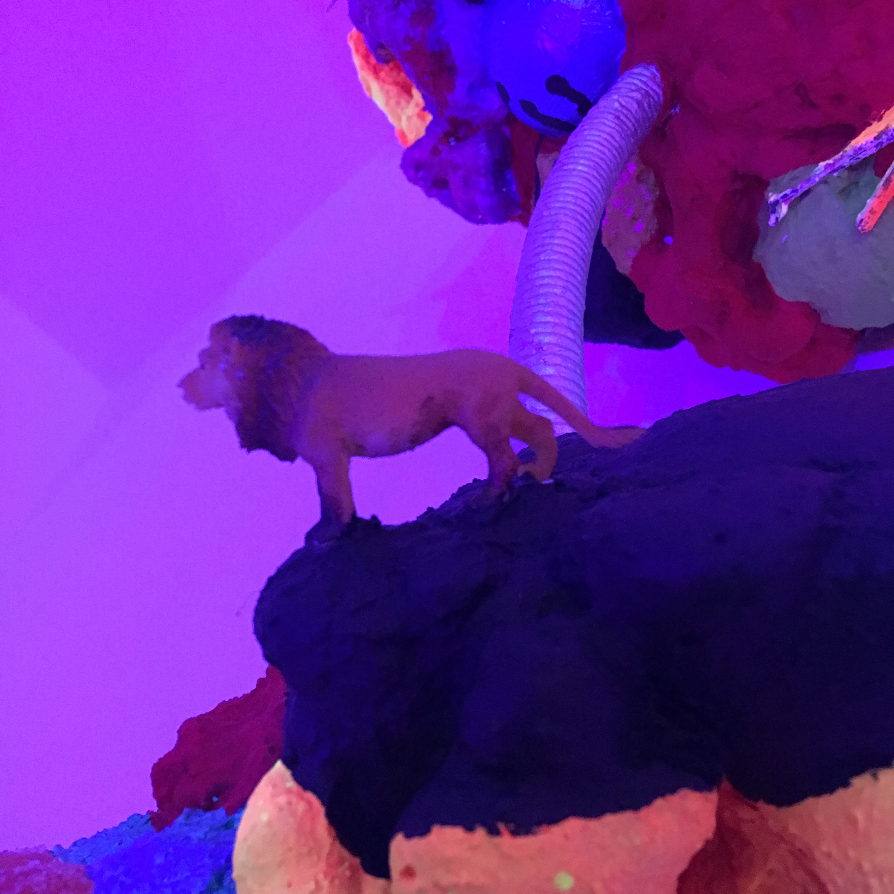 19 esculturas, espelhos de observação, tapetes circulares prateados, e iluminação de solo azul e lilás
