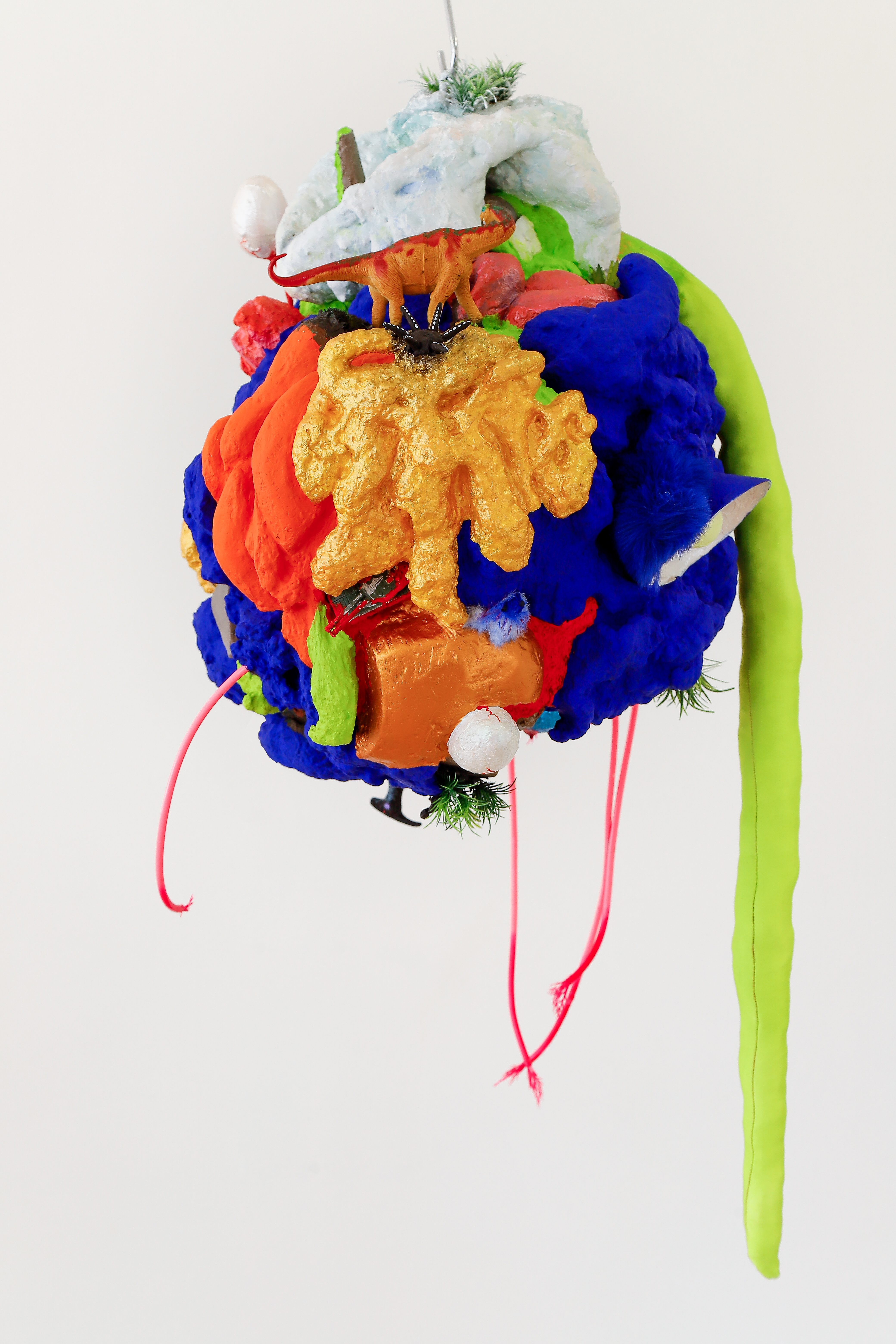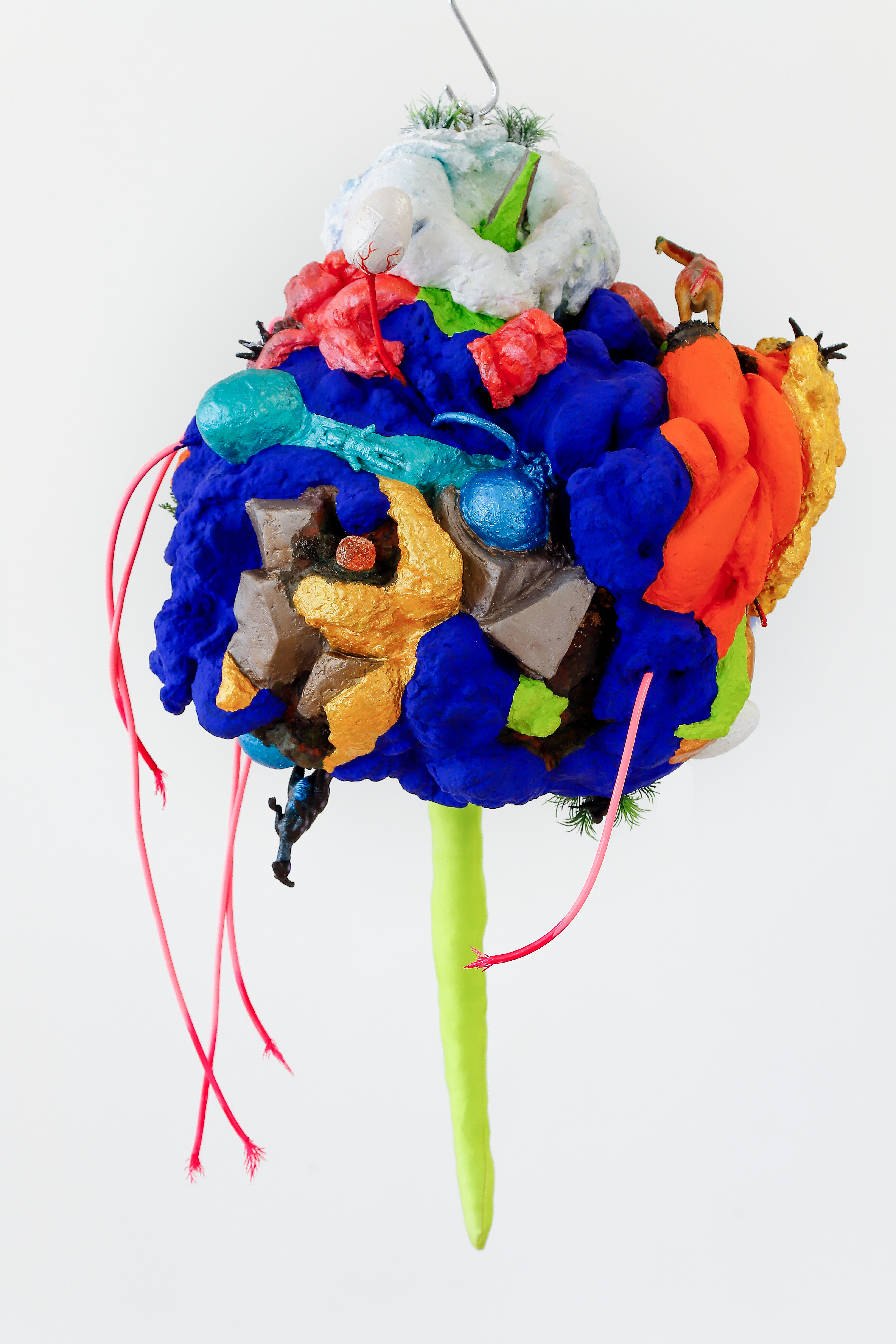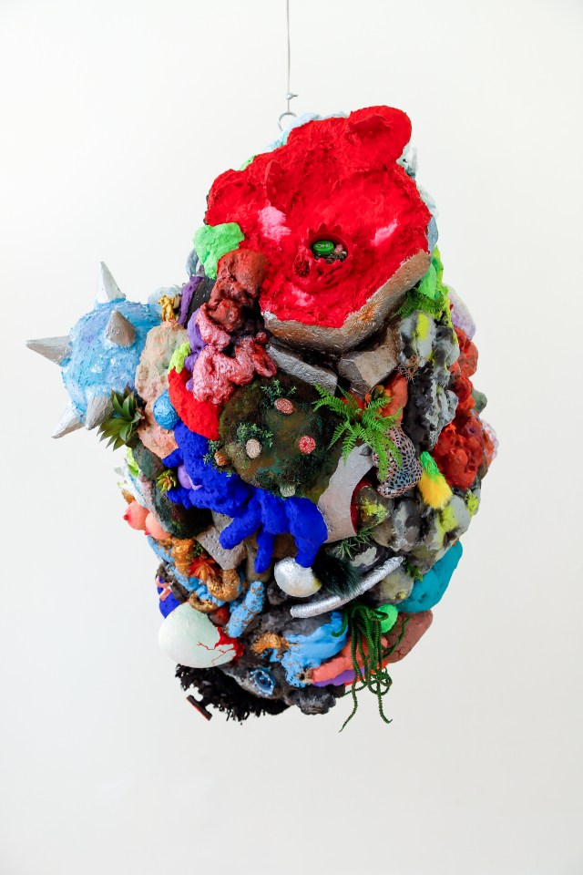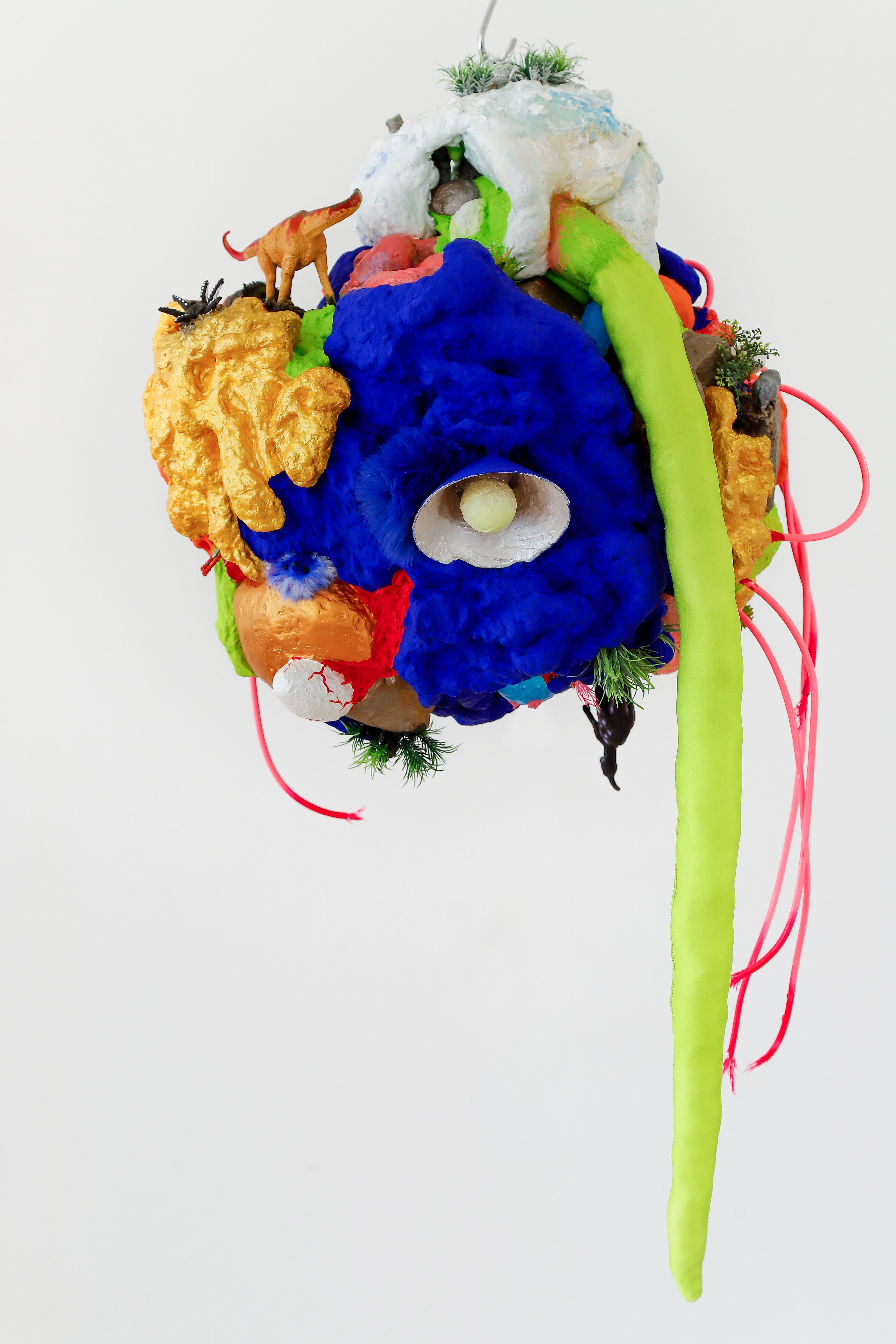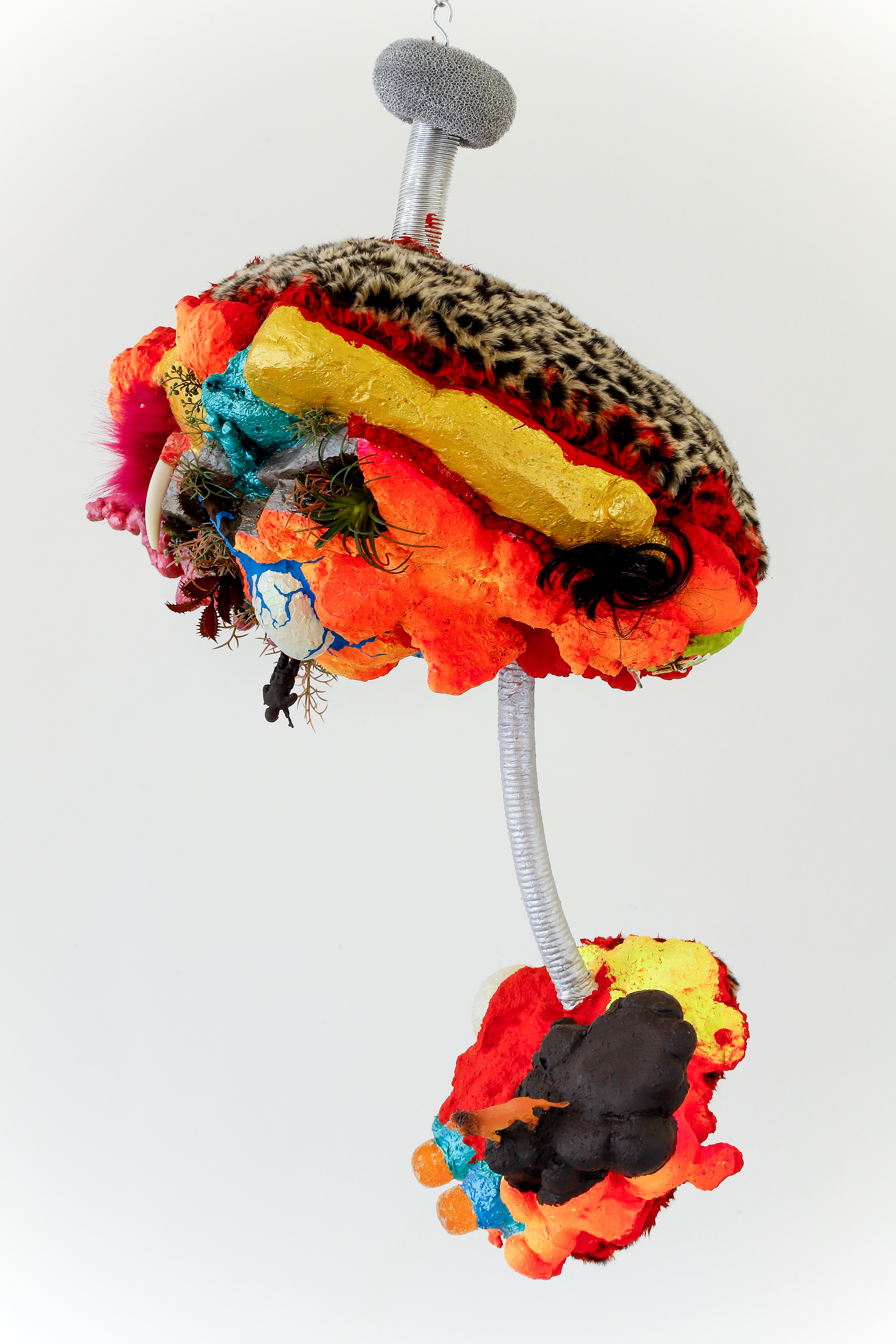 espuma expansiva, peças plásticas, tecidos, arames, objetos, pintura acrílica