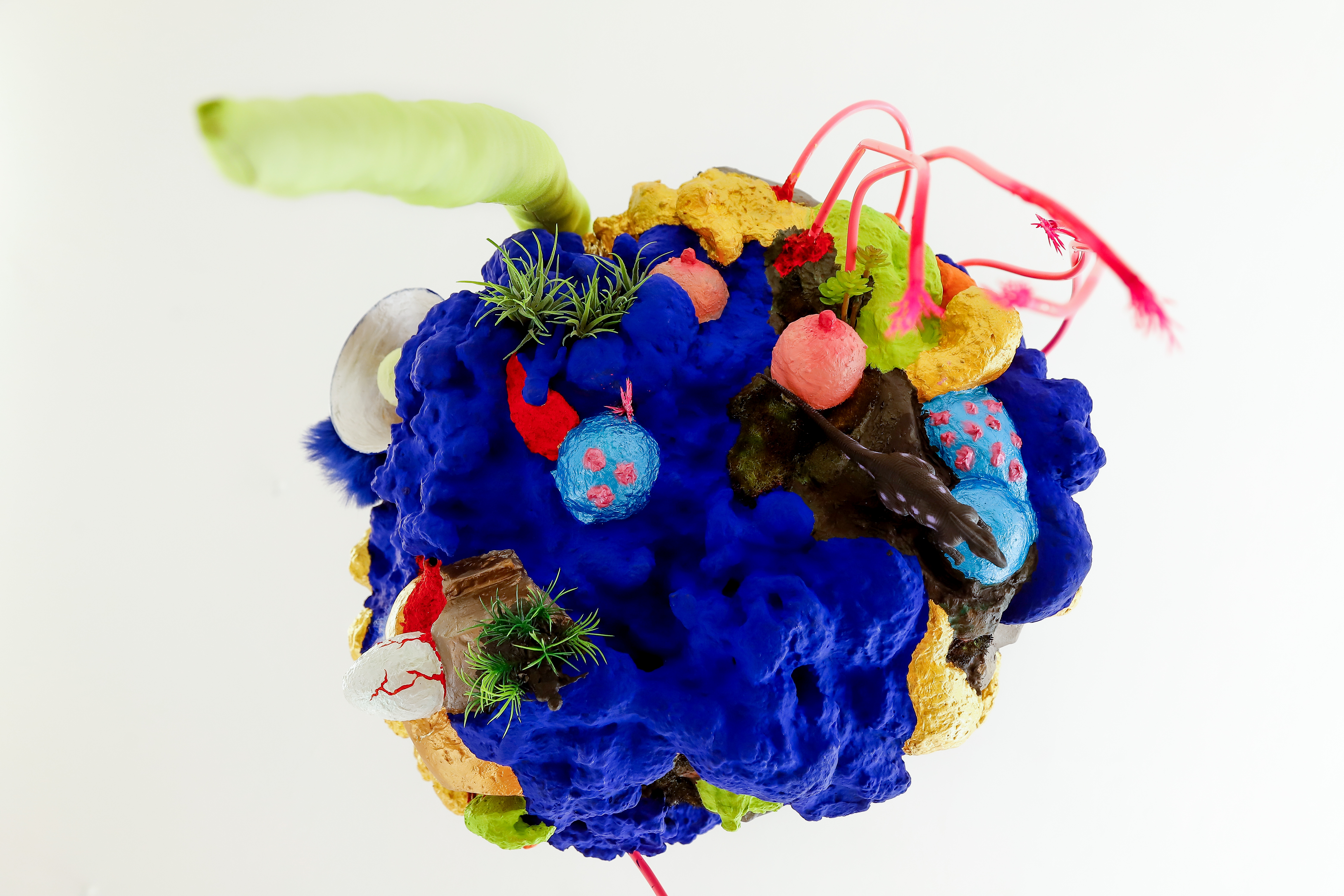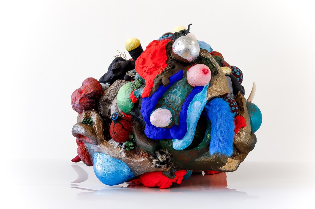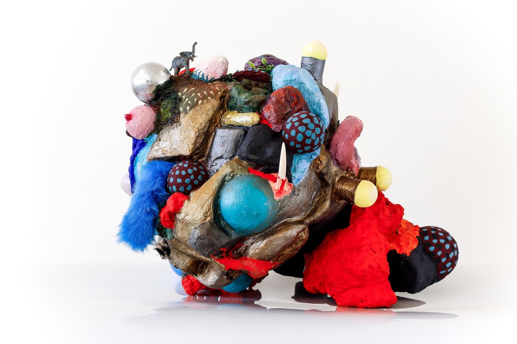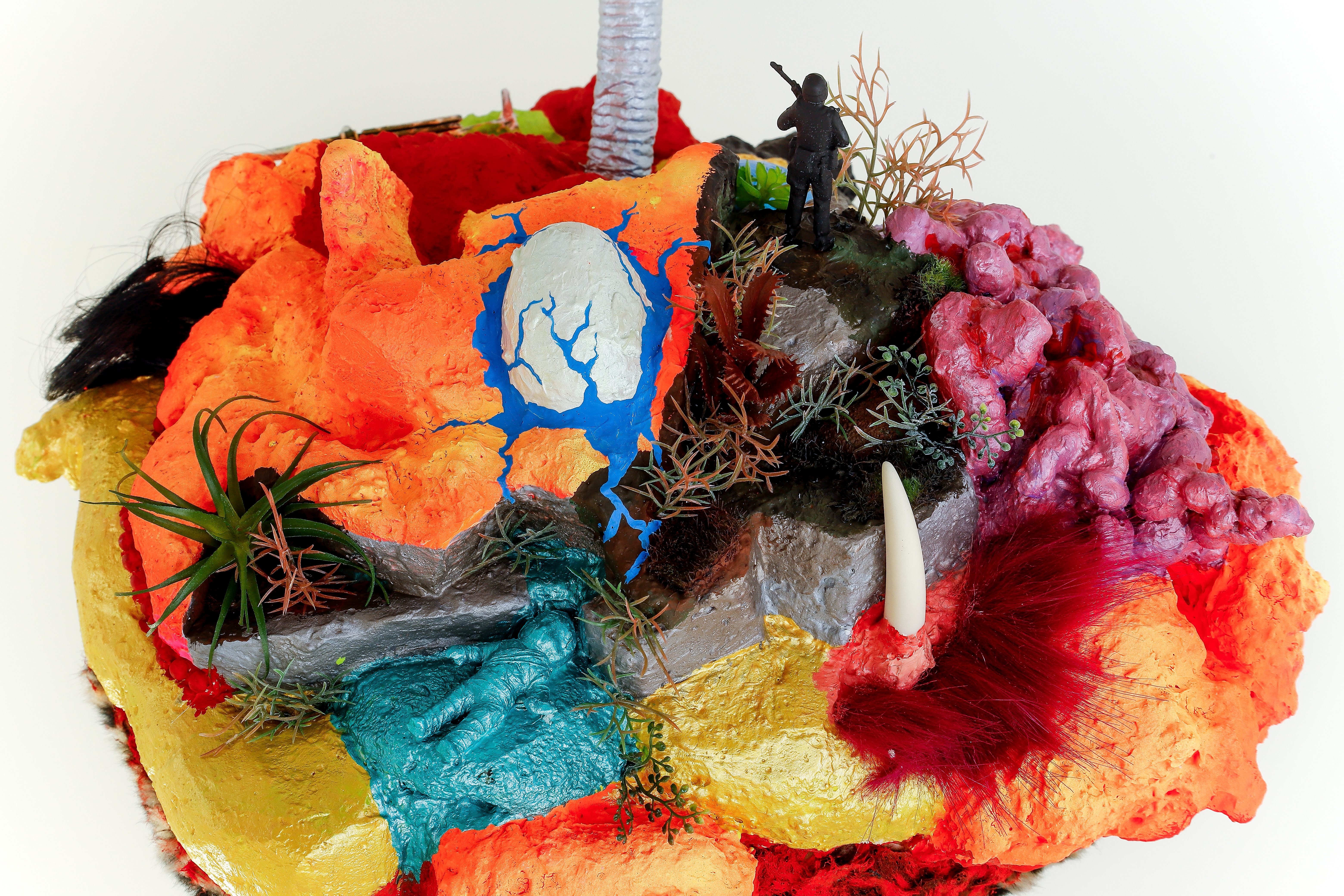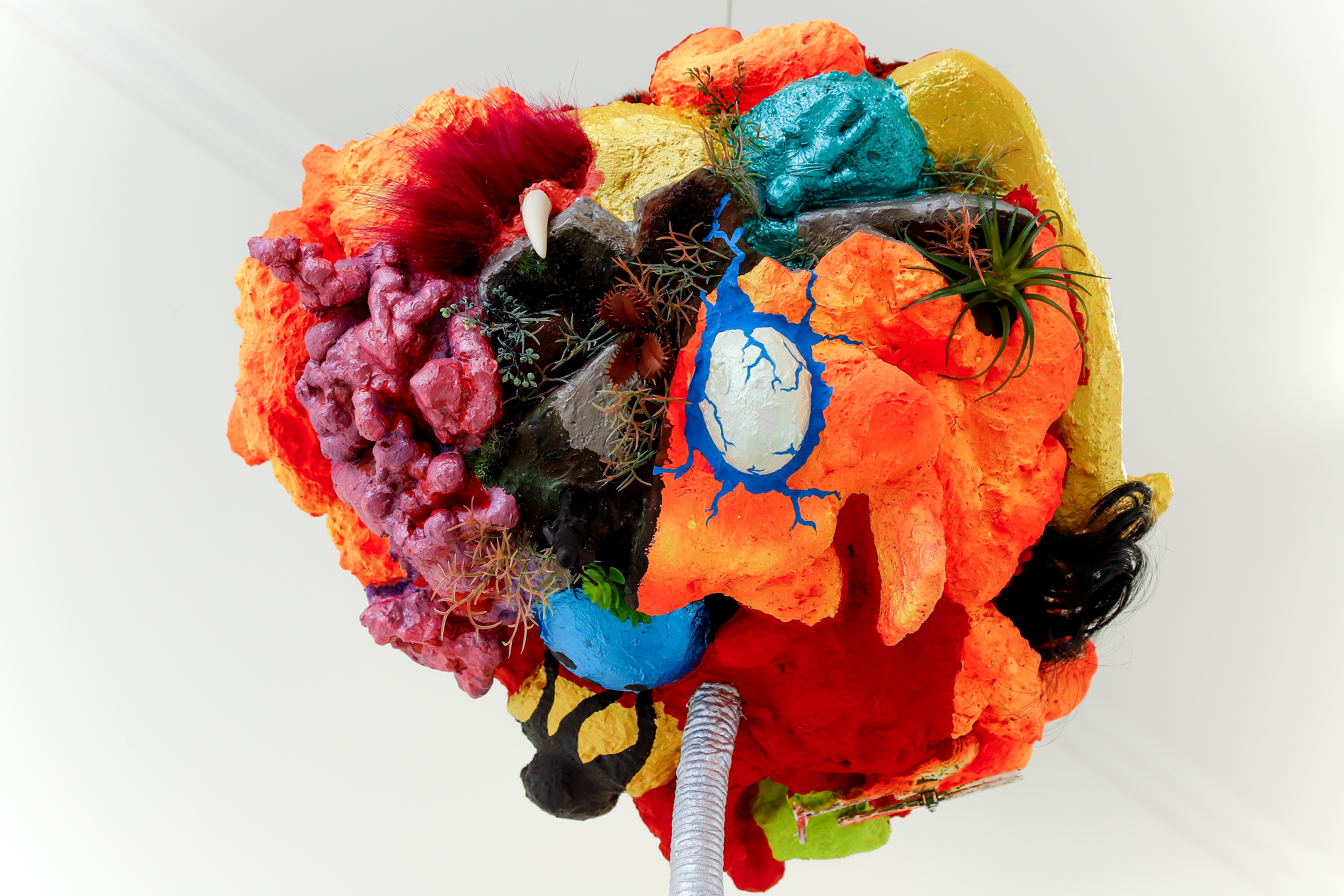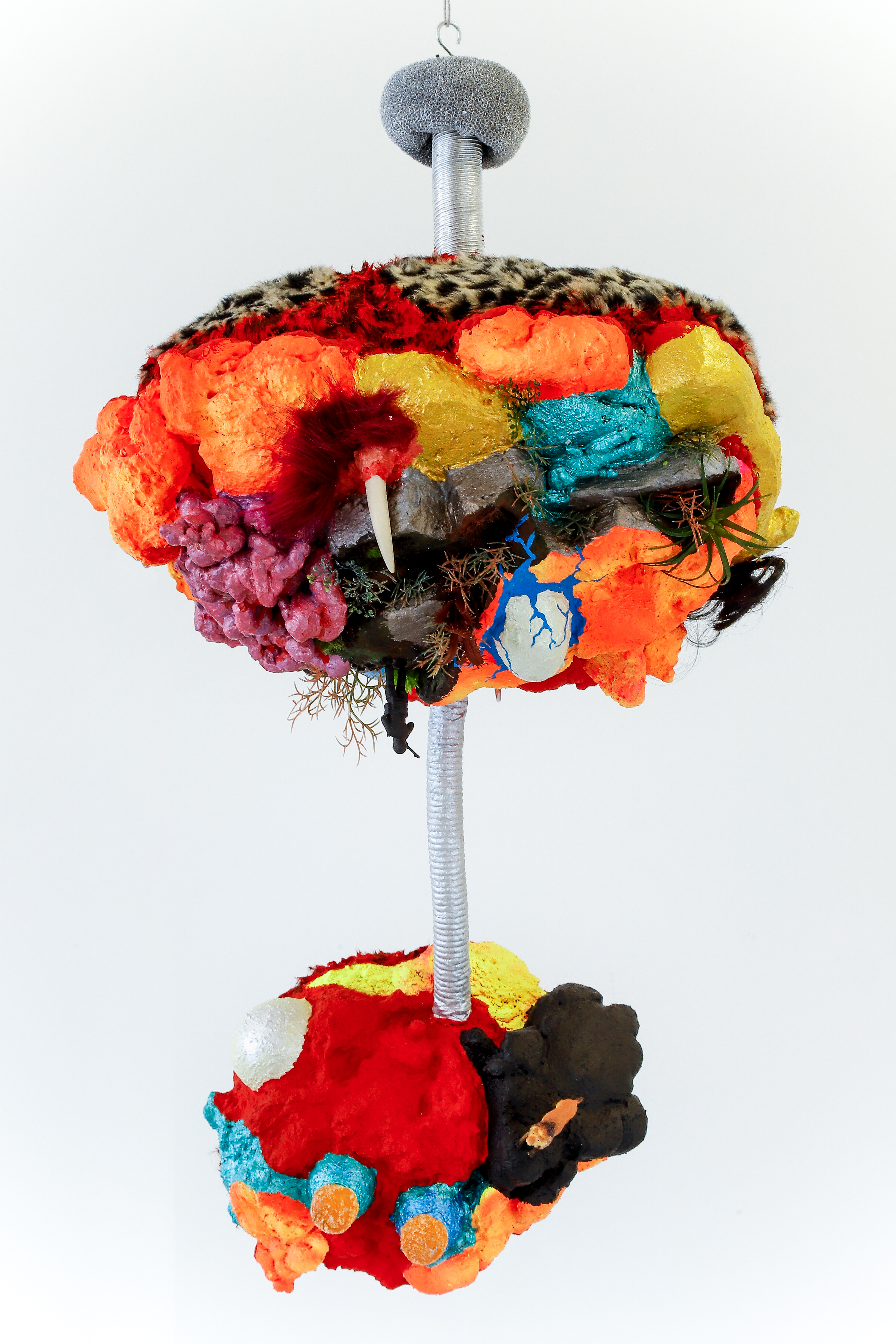 espuma expansiva, peças plásticas, tecidos, arames, objetos, pintura acrílica