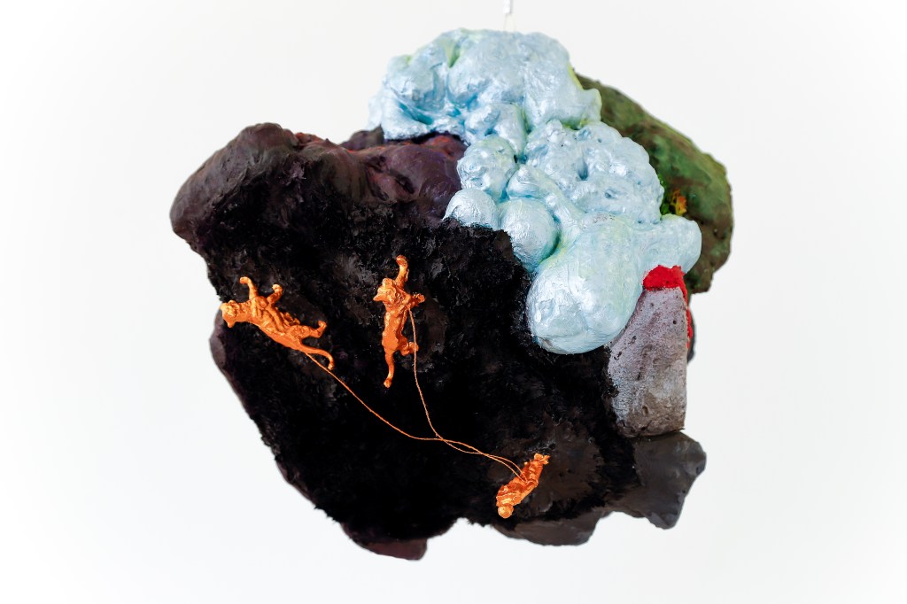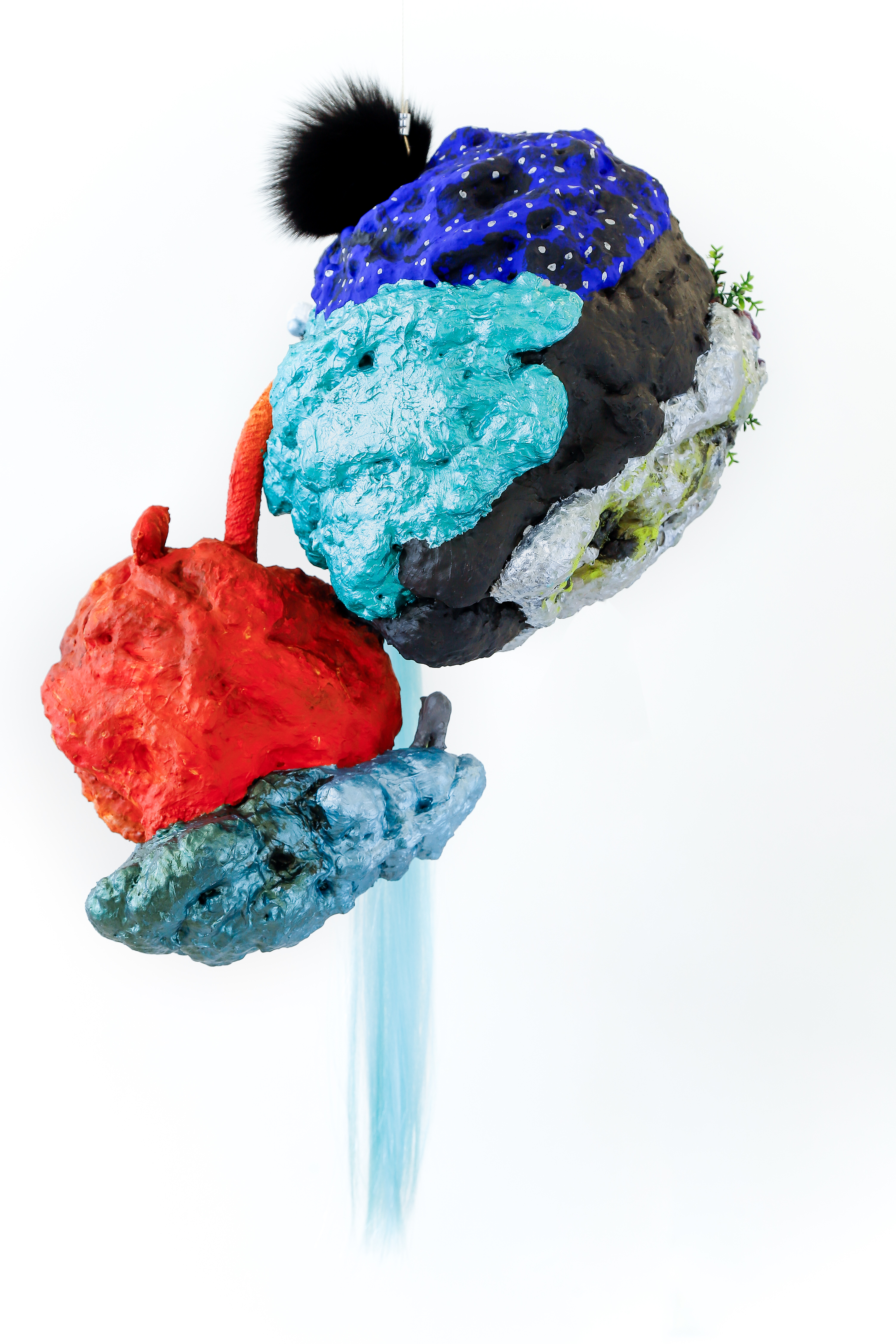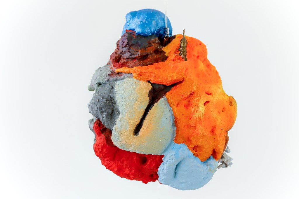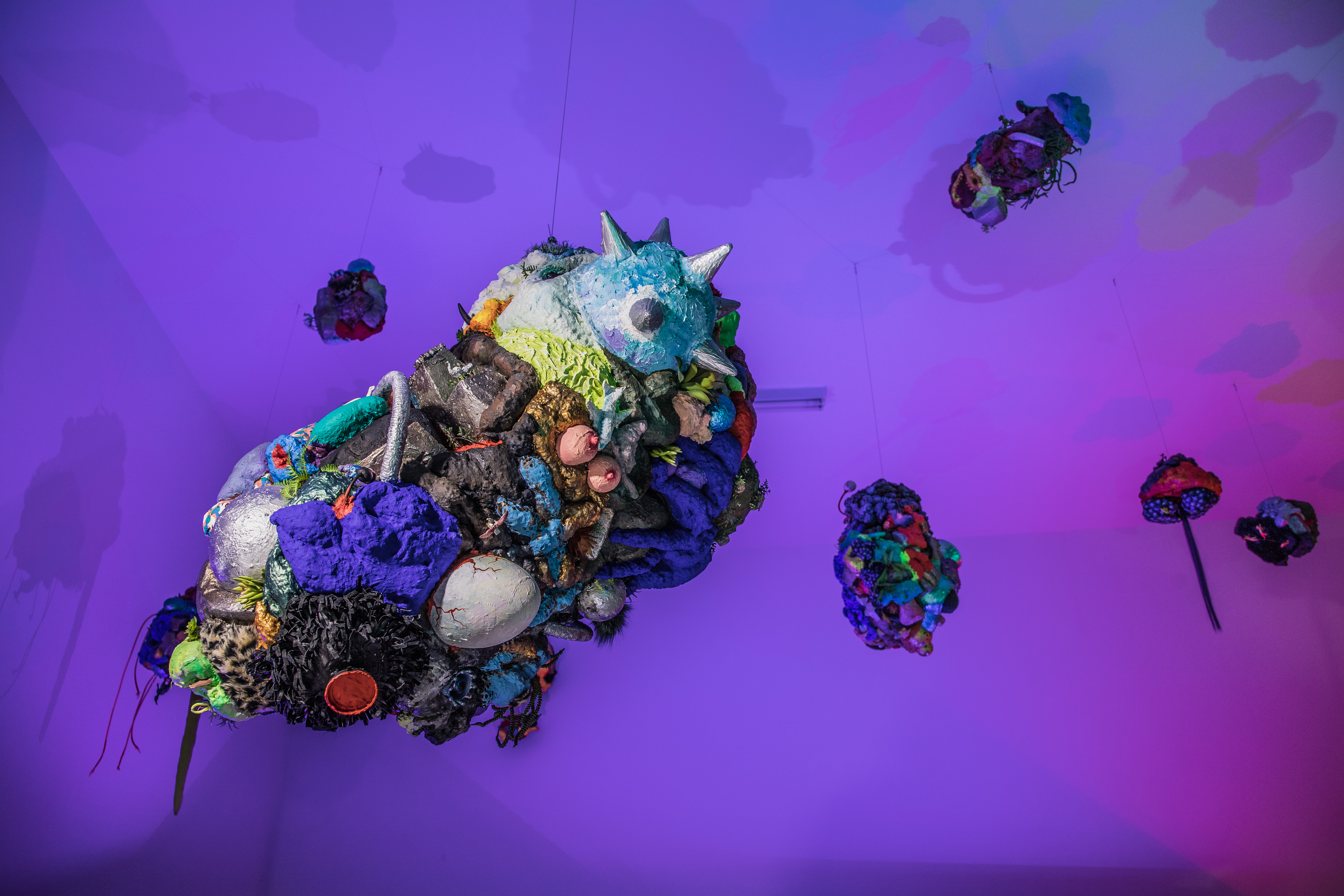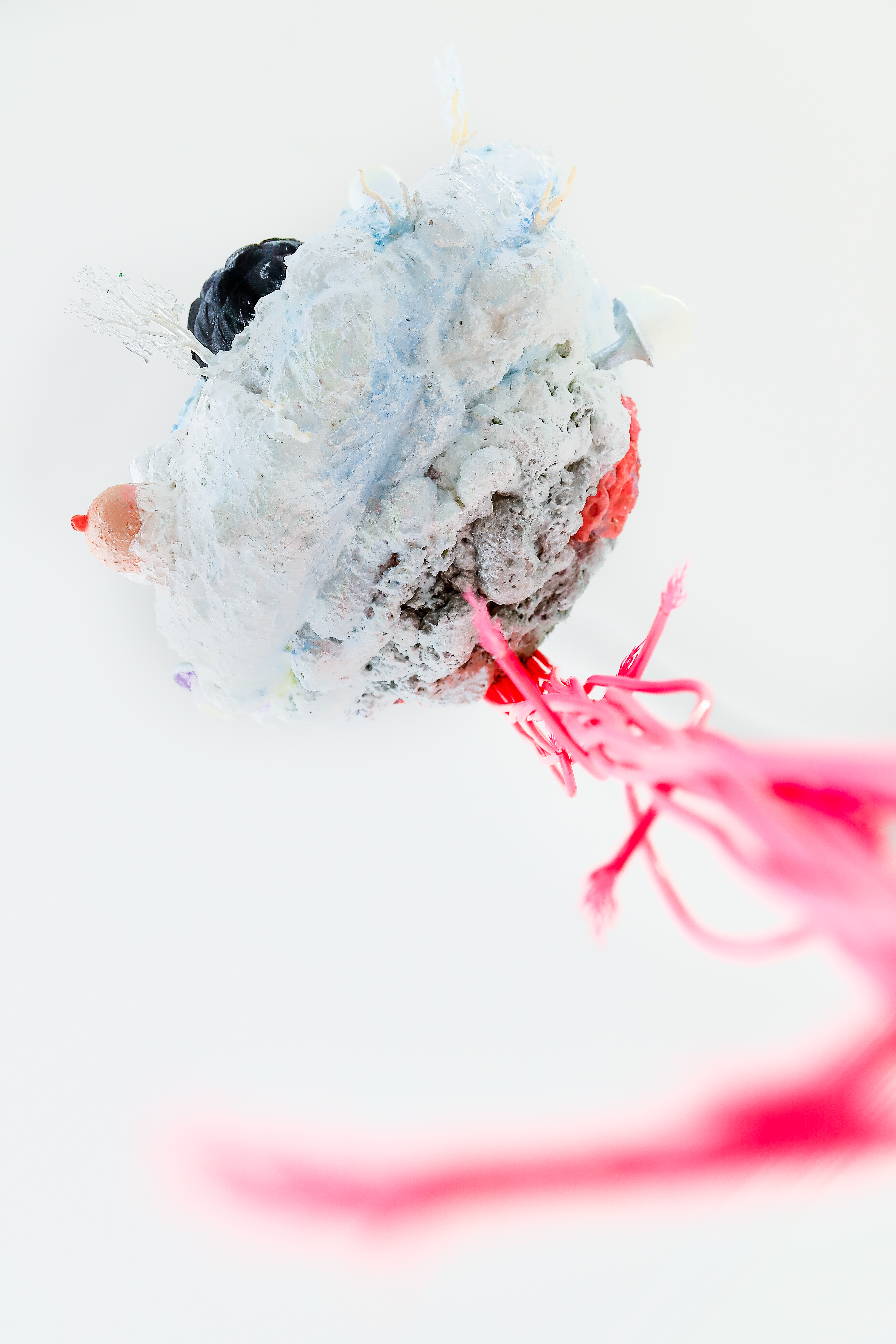 espuma expansiva, peças plásticas, tecidos, arames, objetos, pintura acrílica