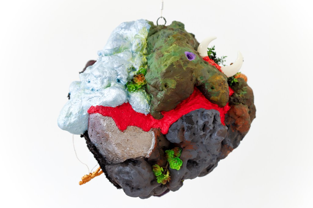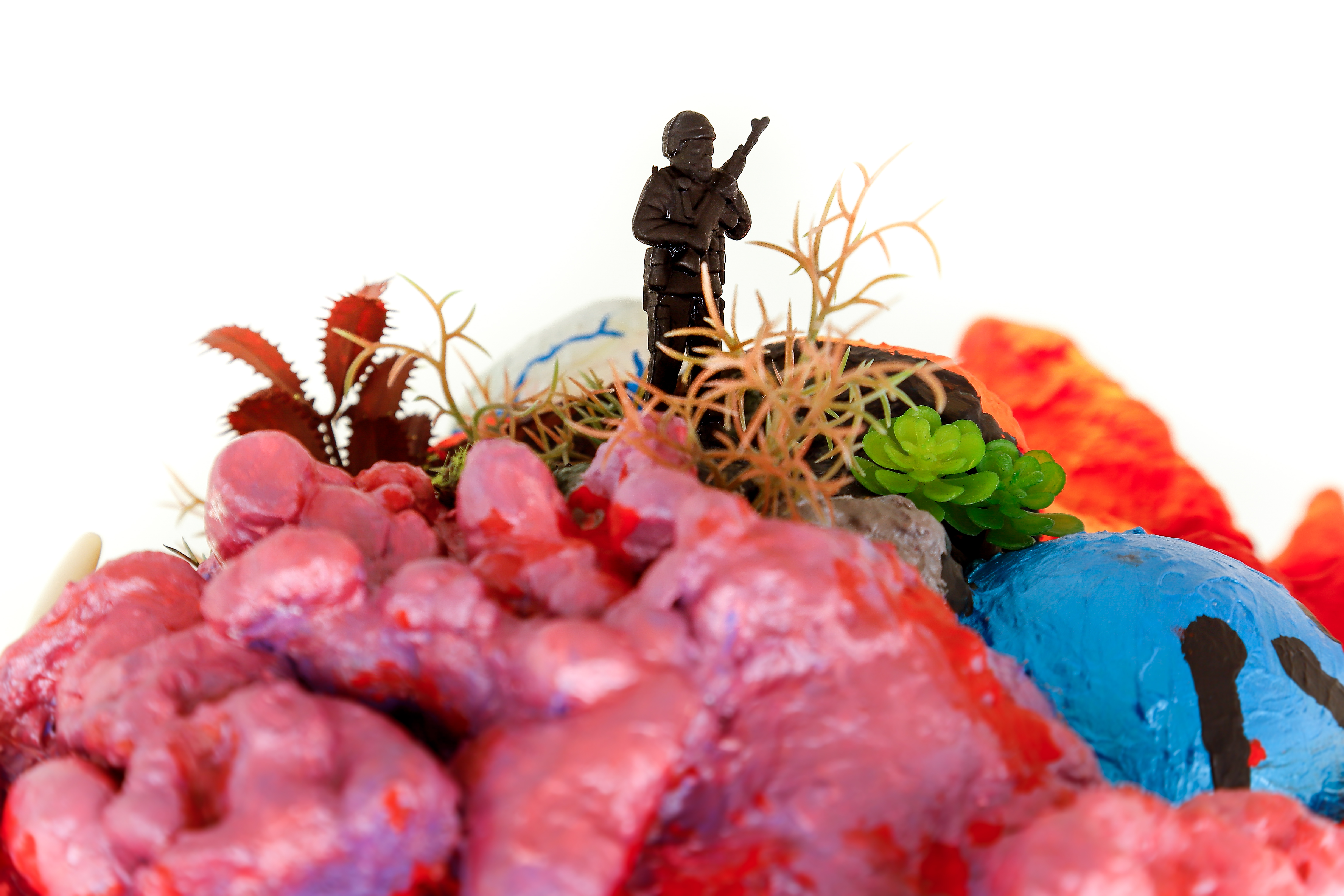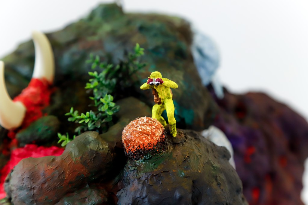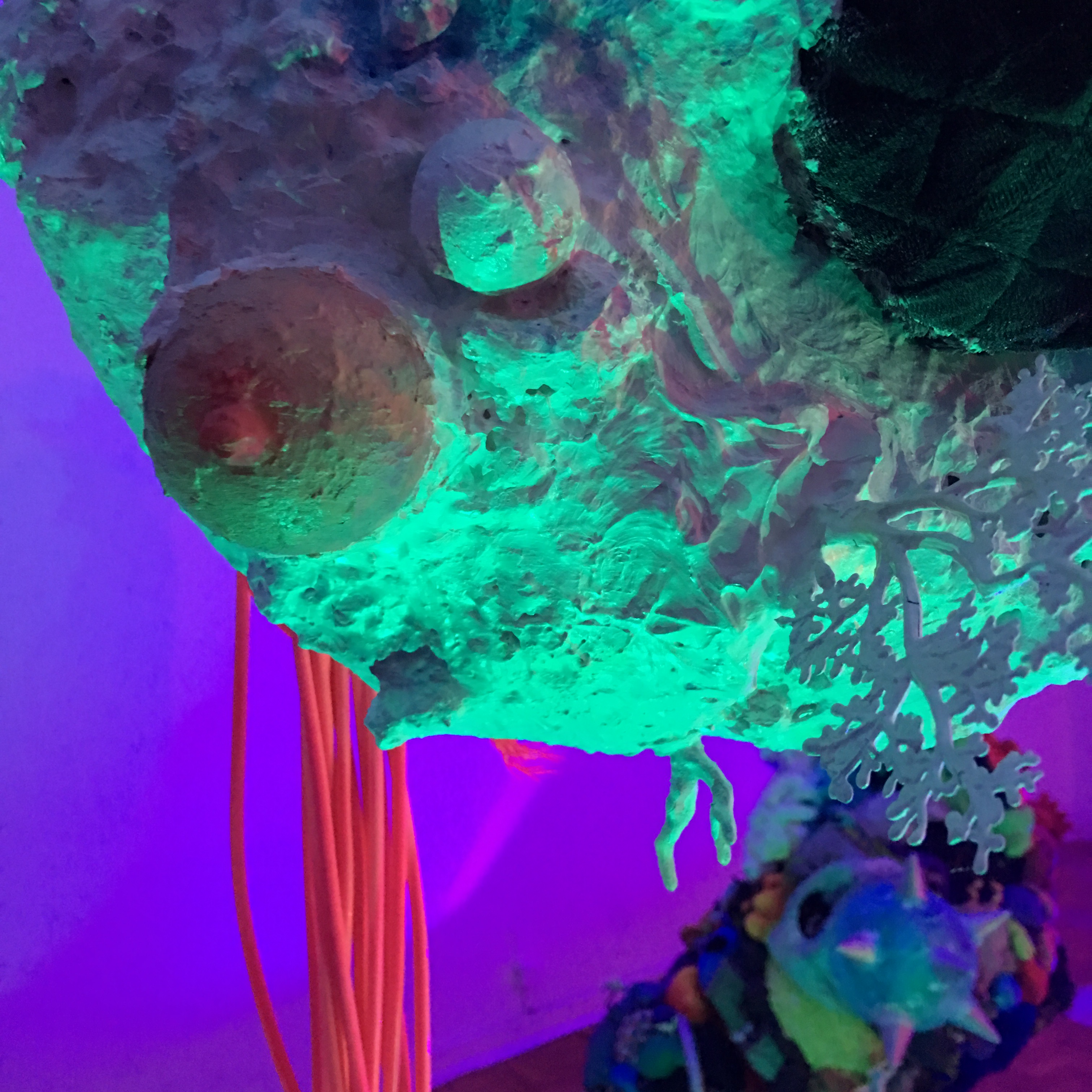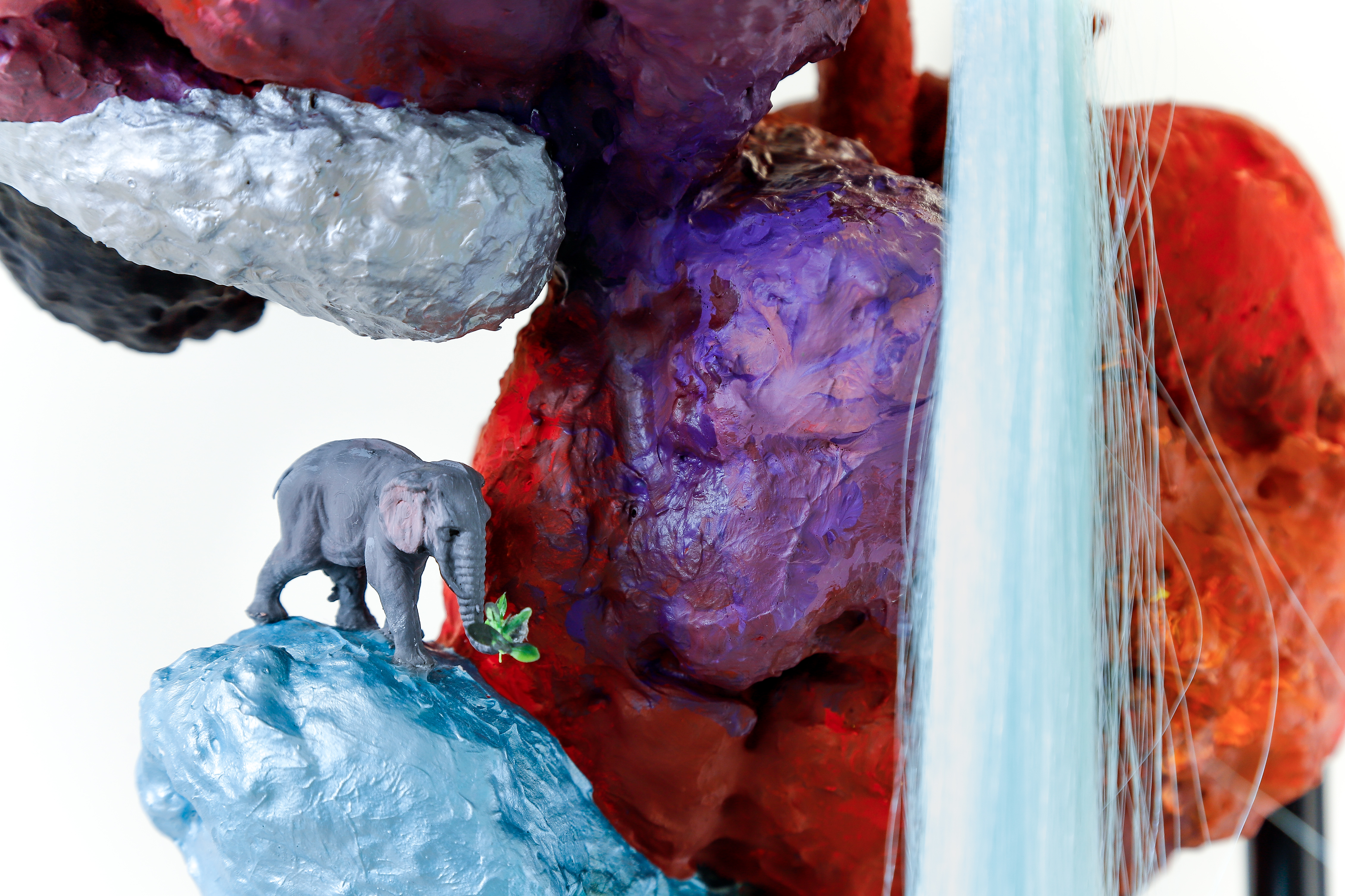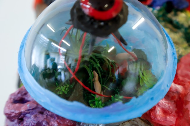espuma expansiva, peças plásticas, tecidos, arames, objetos, pintura acrílica