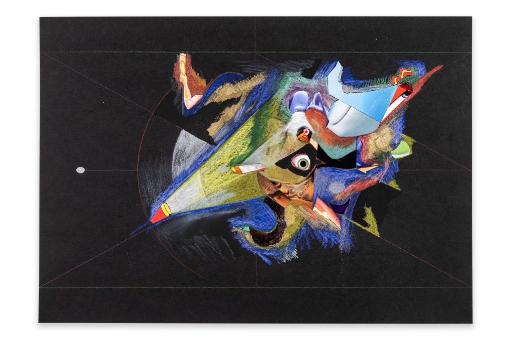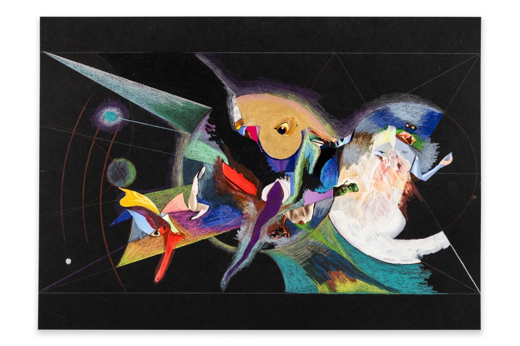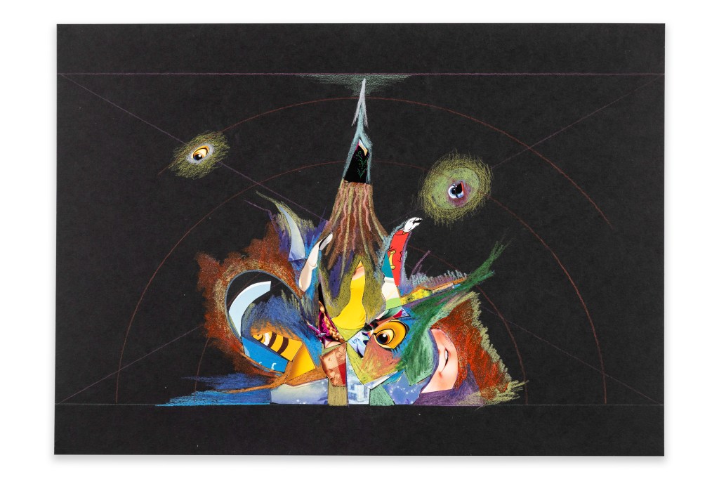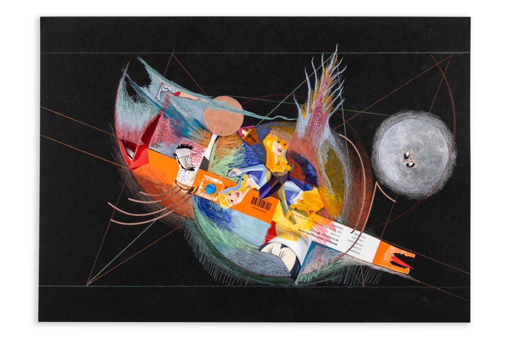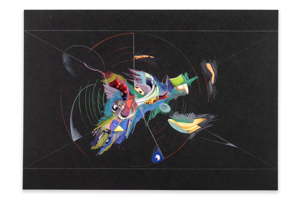 Os fragmentos instauram novas relações visuais e simbólicas, transformando personagens da cultura de massa em arquétipos em trânsito que, reconfigurados em constelações sobre papel hahnemhule preto, adquirem dimensão cósmica e mítica.