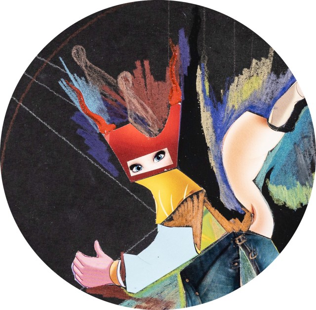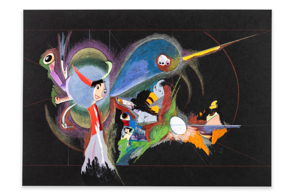 Para estas obras, uso cromos recortados de álbum da Disney. Estes cromos, deslocados de sua função original e reinscritos em um campo pictórico expandido com intervenções de tinta acrílica, guache, PVA, caneta pen-touch e lápis de cor , rompem a lógica do objeto colecionável.