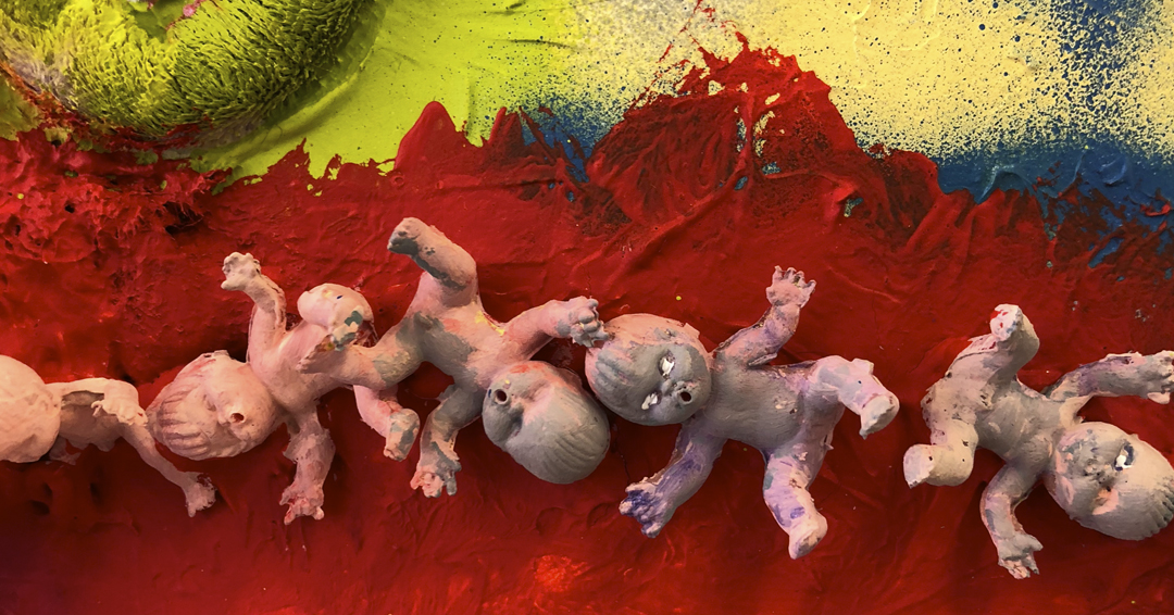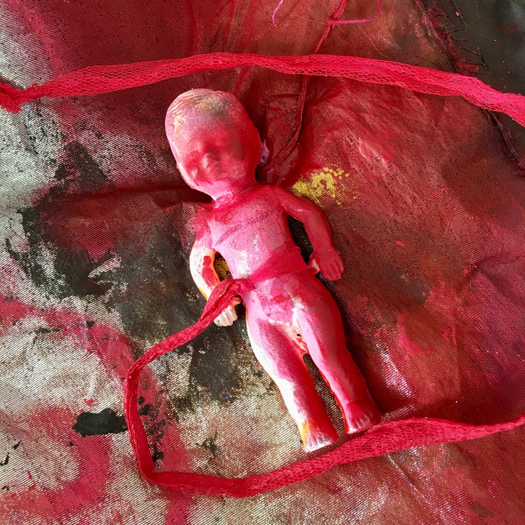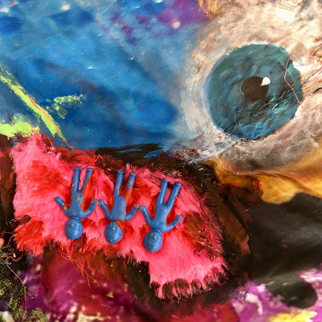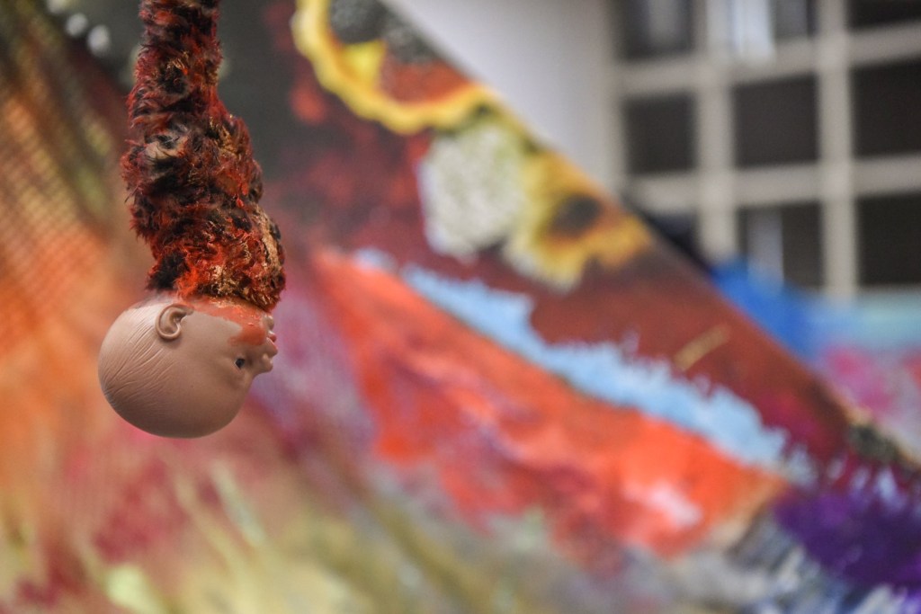 também compõem a obra objetos plásticos guizos e outros elementos como fios, rendas etc.