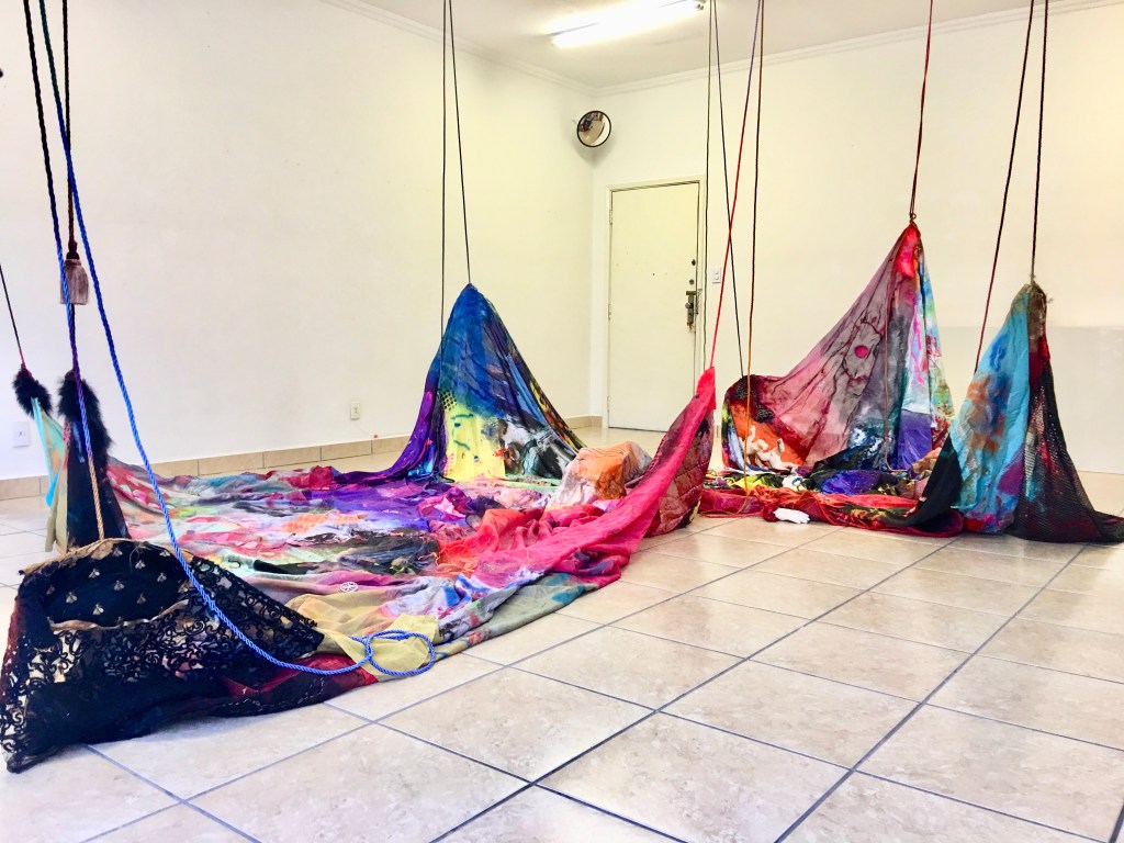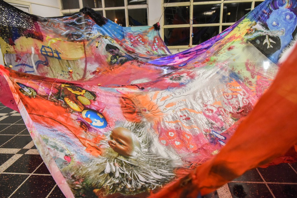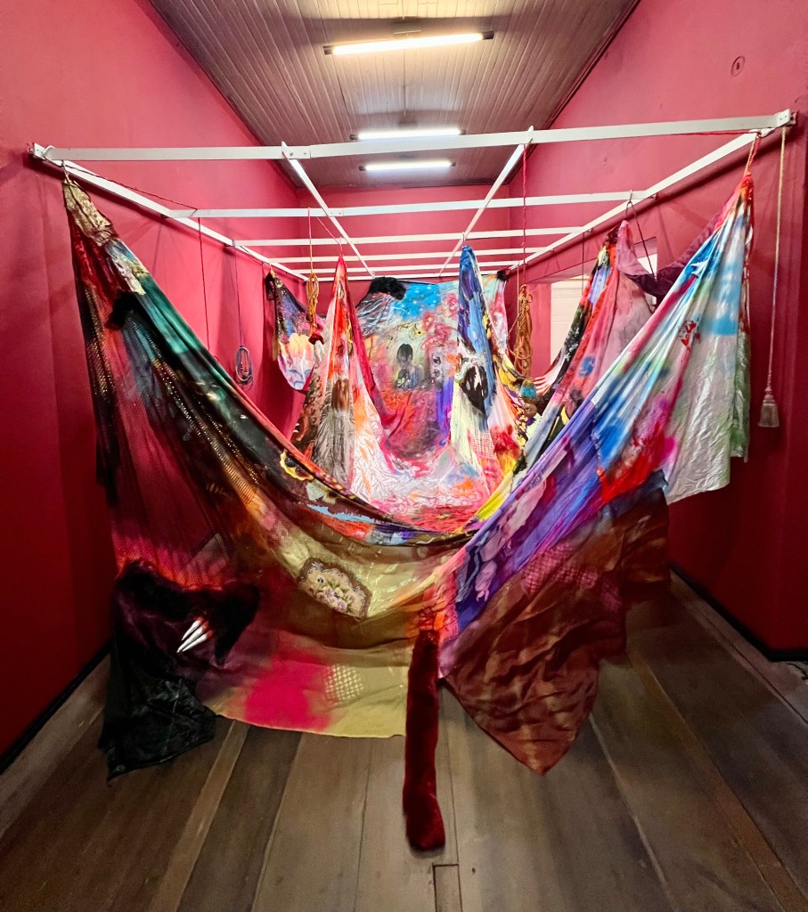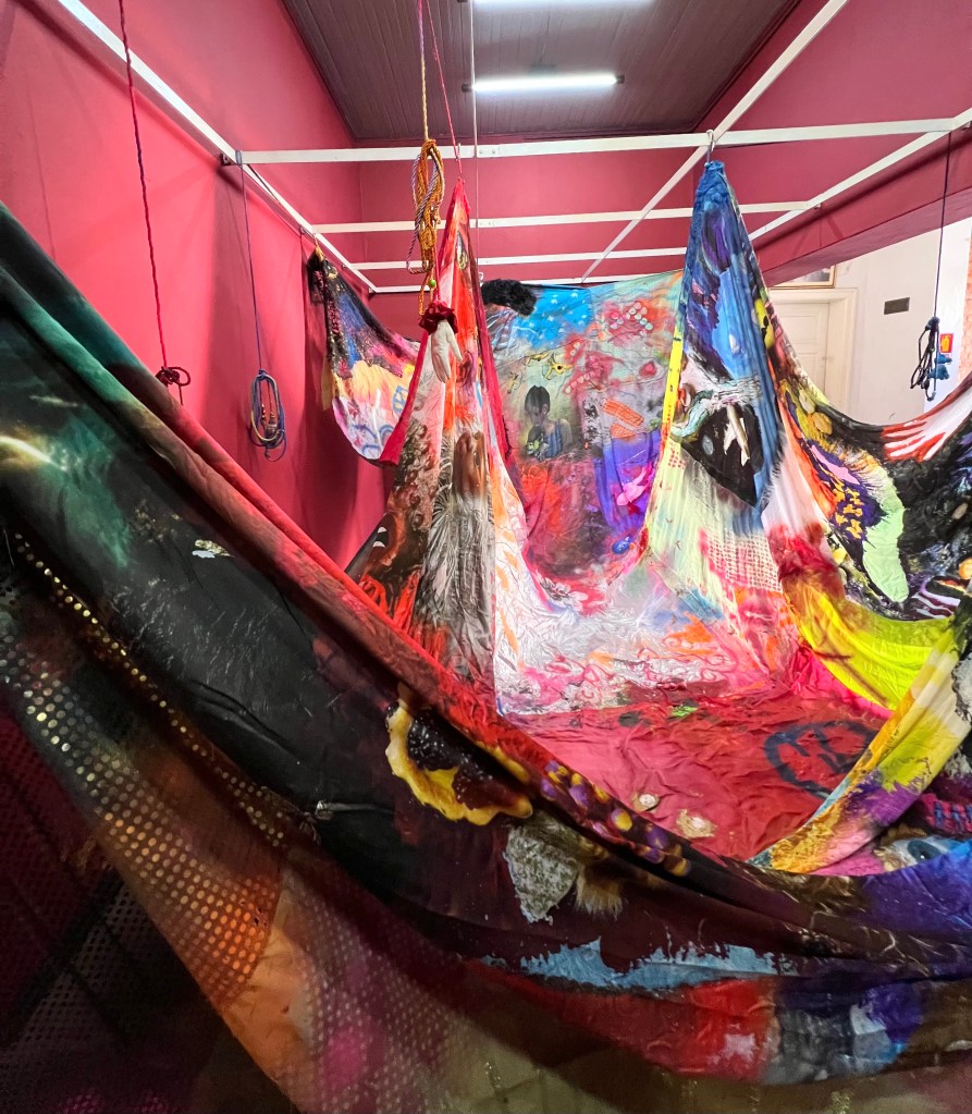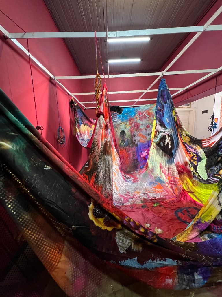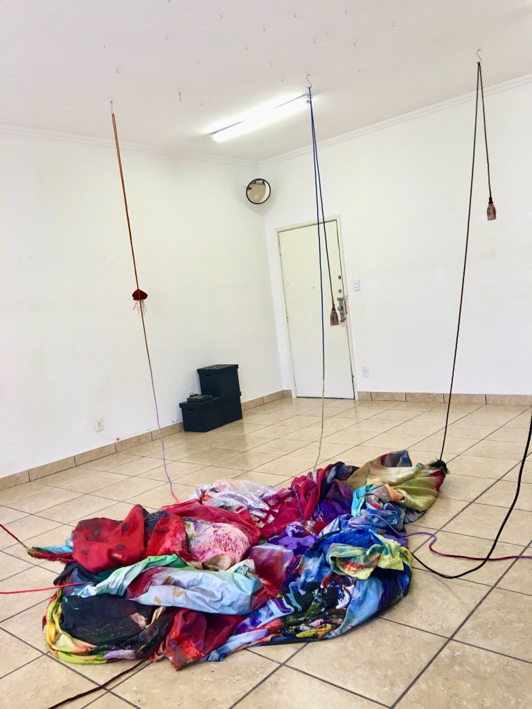 grande plano composto por múltiplos tecidos pintados, tingidos, bordados e com impressão digital, medindo 11 x x 7 m.