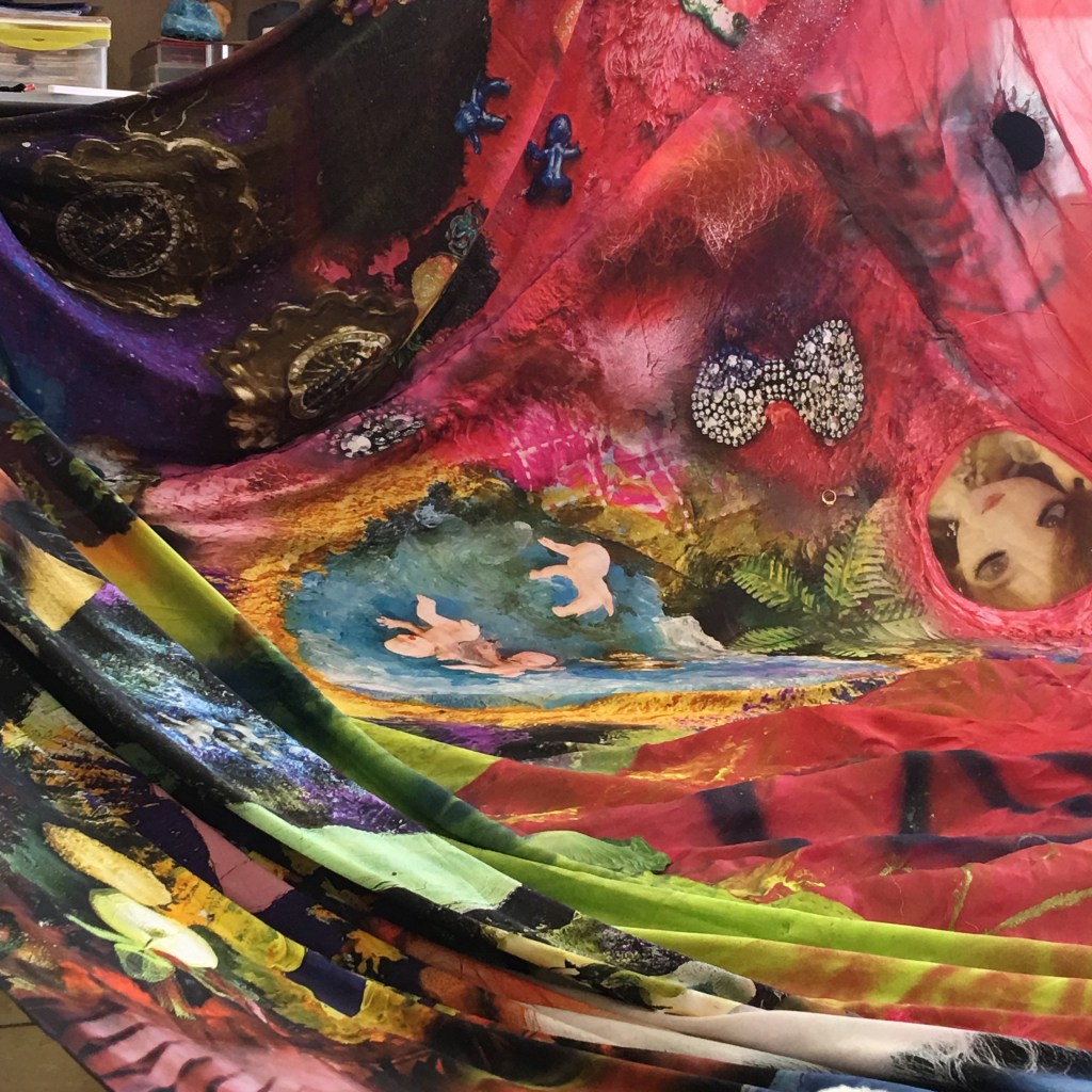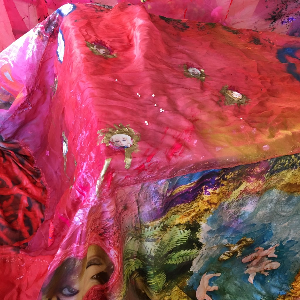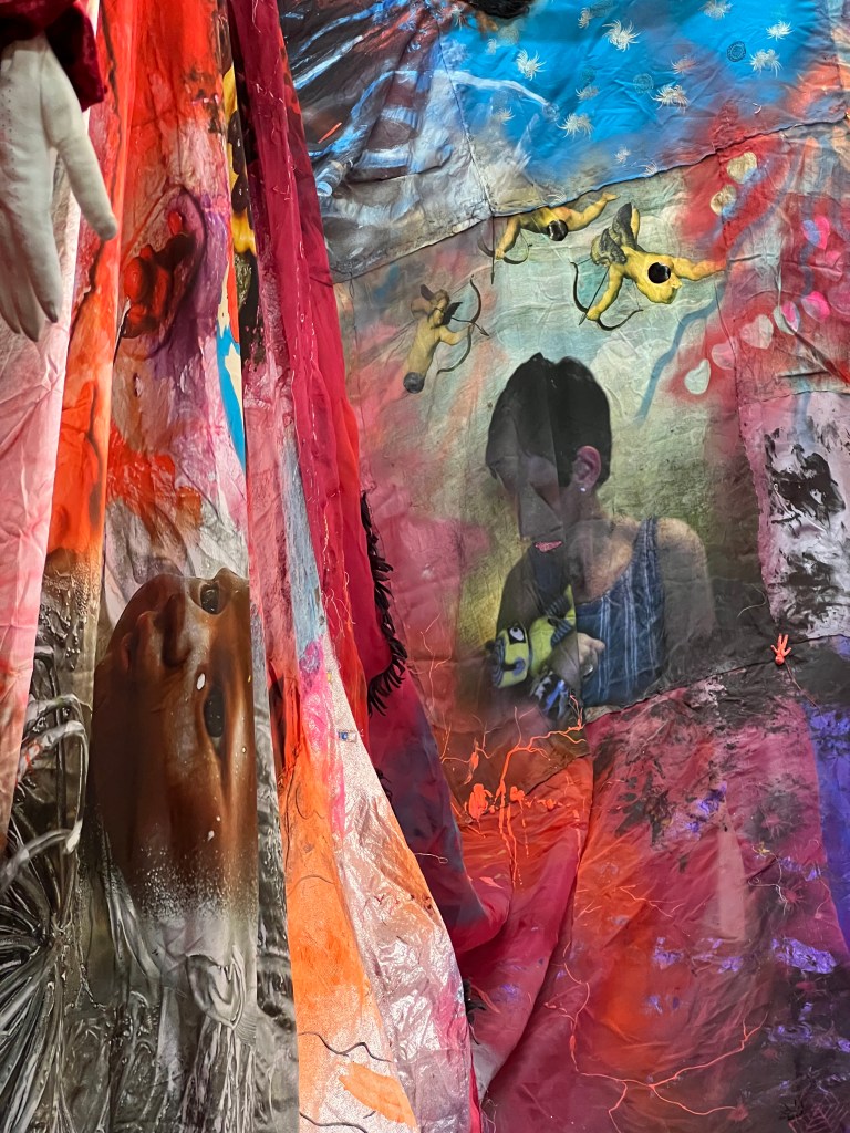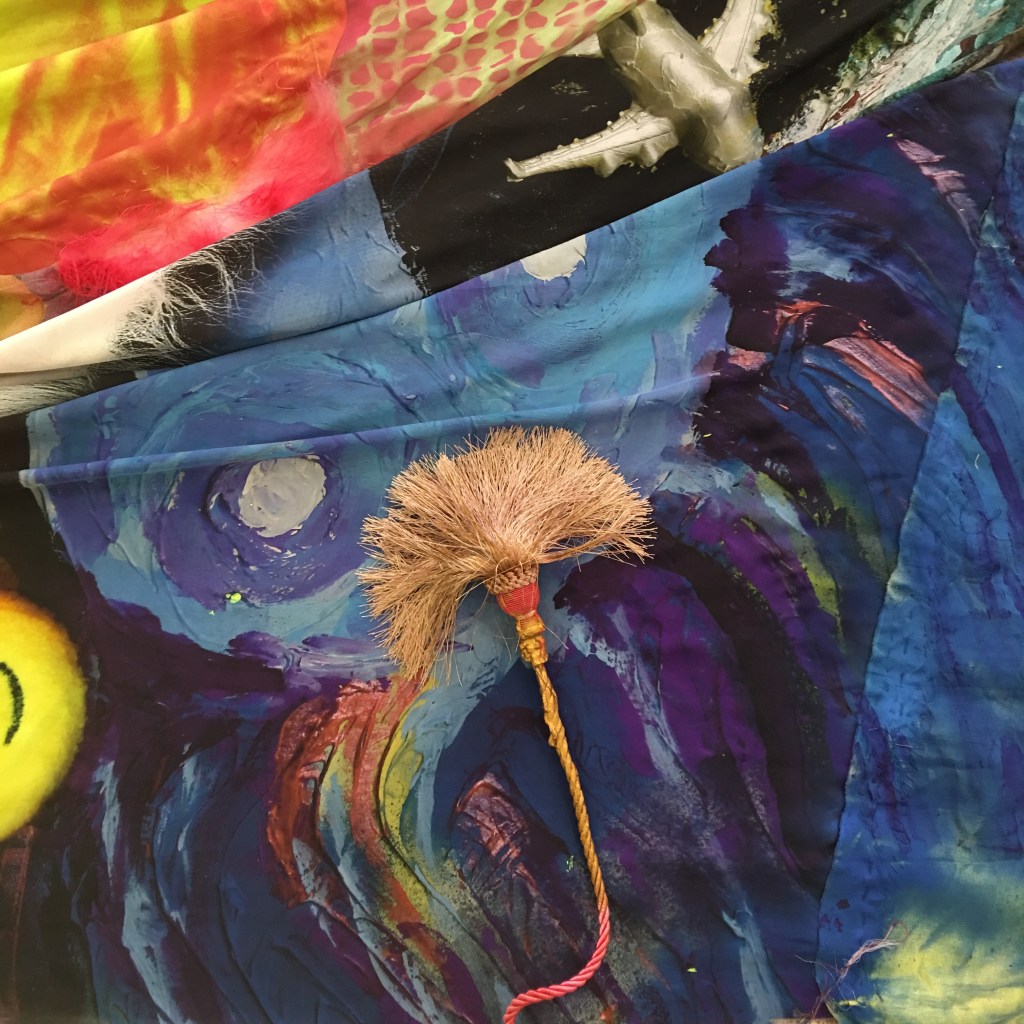 grande plano composto por múltiplos tecidos pintados, tingidos, bordados e com impressão digital, medindo 11 x x 7 m.