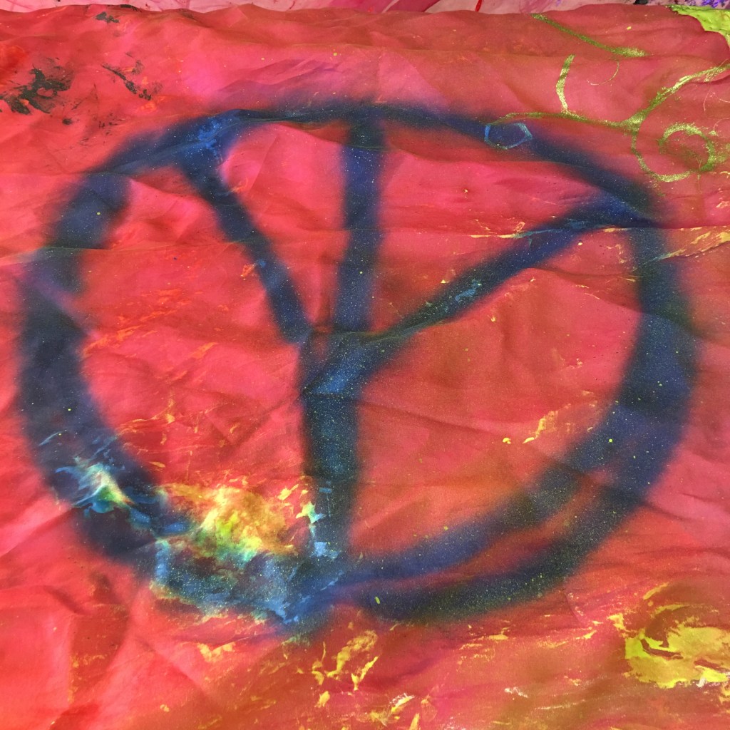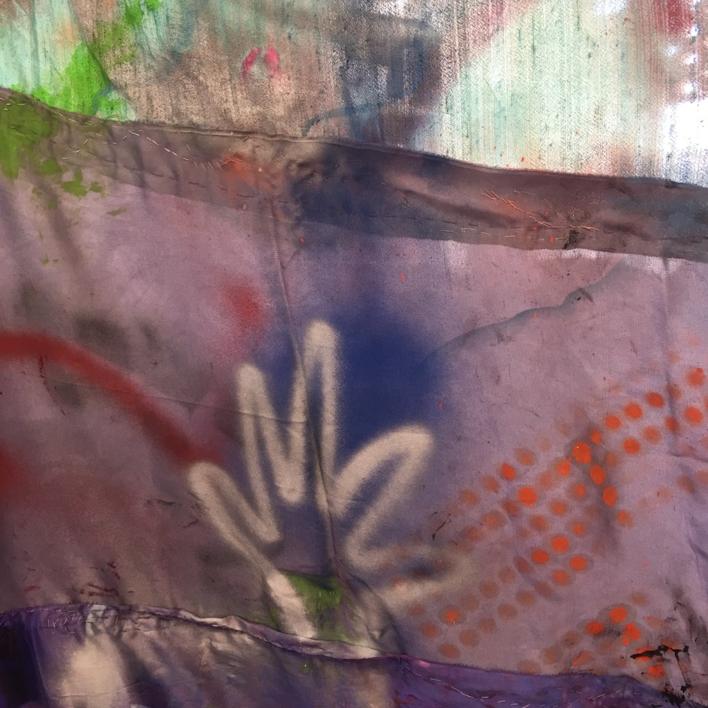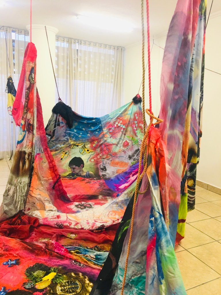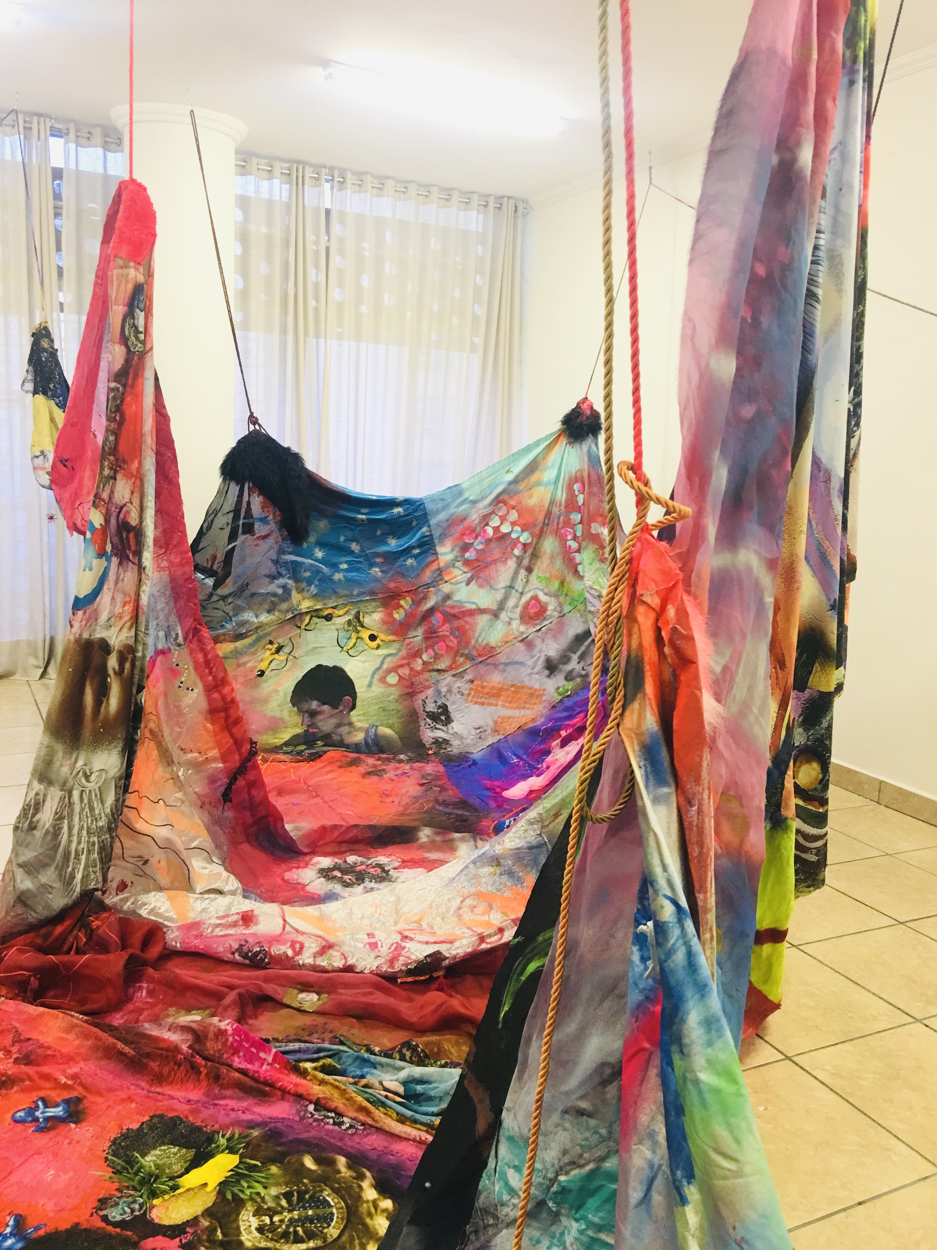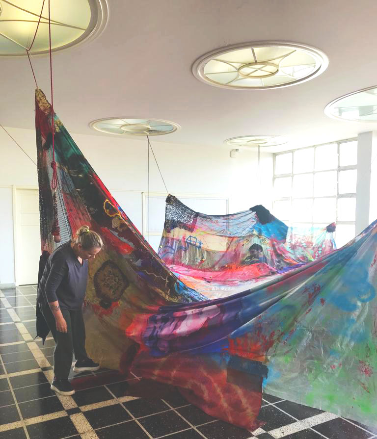 grande plano composto por múltiplos tecidos pintados, tingidos, bordados e com impressão digital, medindo 11 x x 7 m.