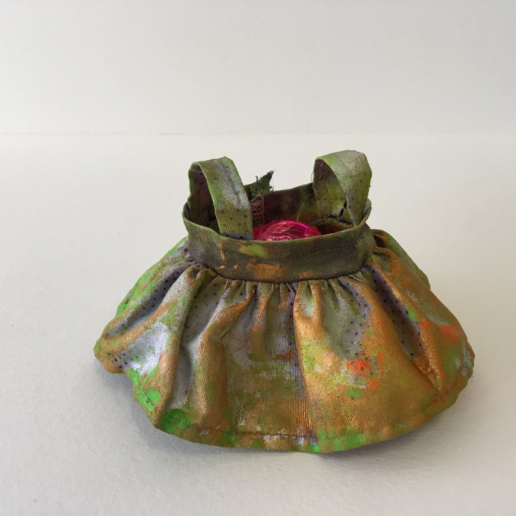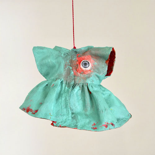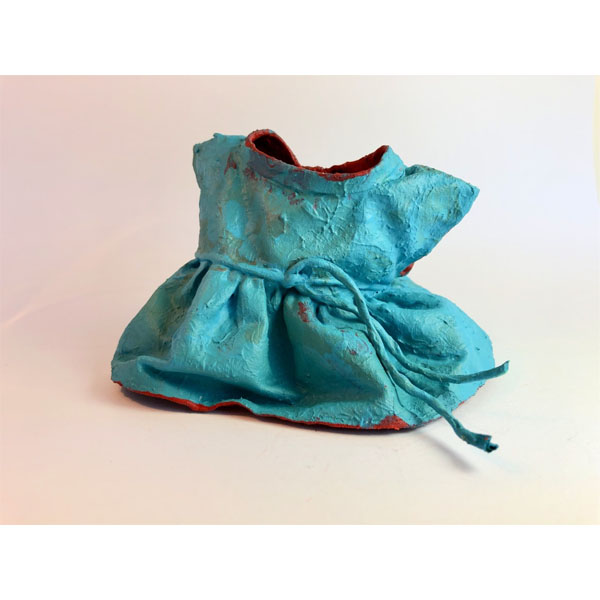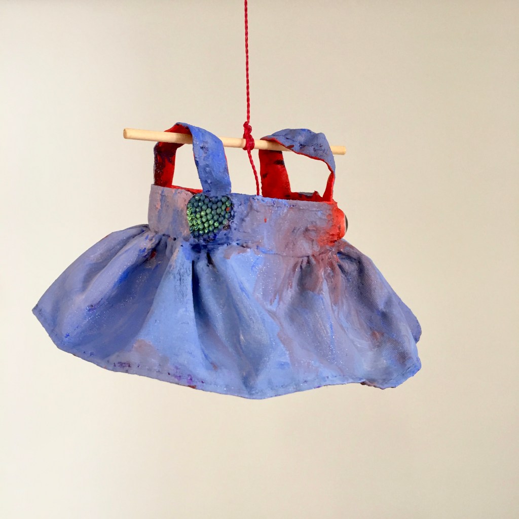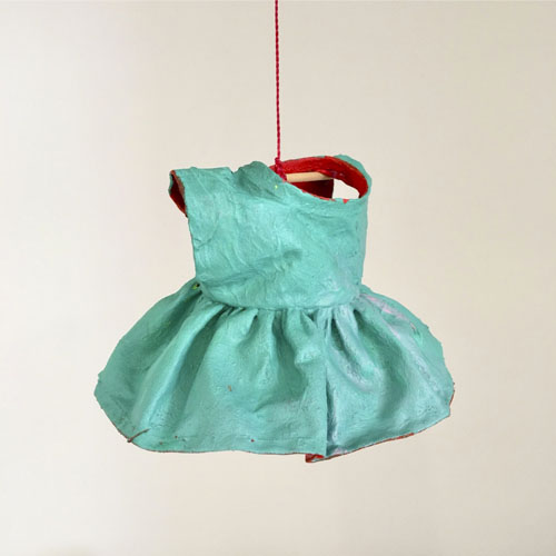 instalação composta por 36 esculturas de vestidos, estruturados com massa acrílica e pintados com tinta acrílica. Medem aproximadamente 10 x 10 x 10 cm