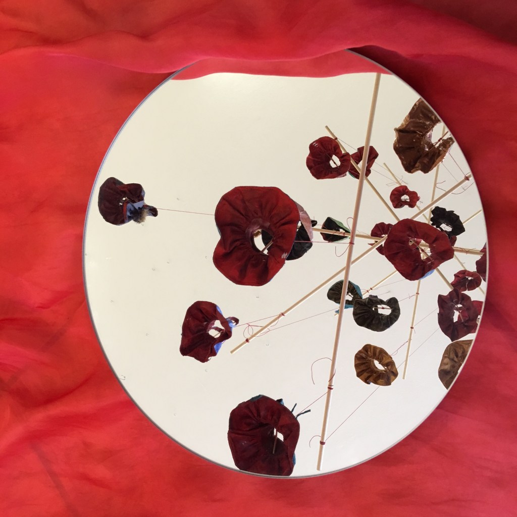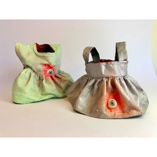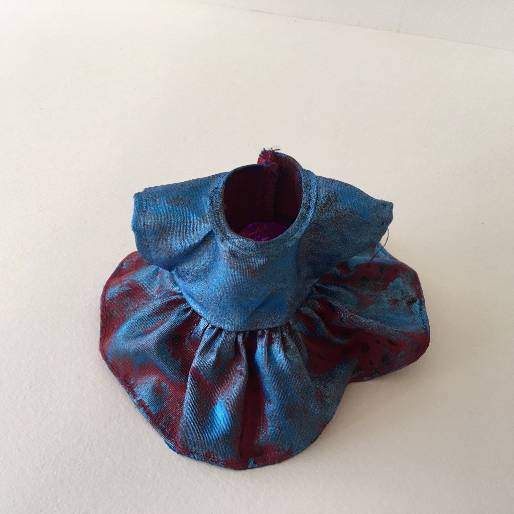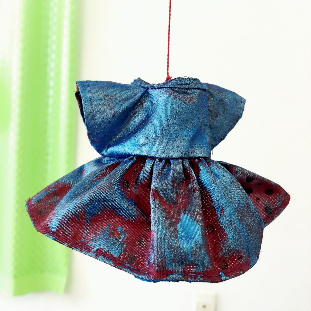 instalação composta por 36 esculturas de vestidos, estruturados com massa acrílica e pintados com tinta acrílica. Medem aproximadamente 10 x 10 x 10 cm