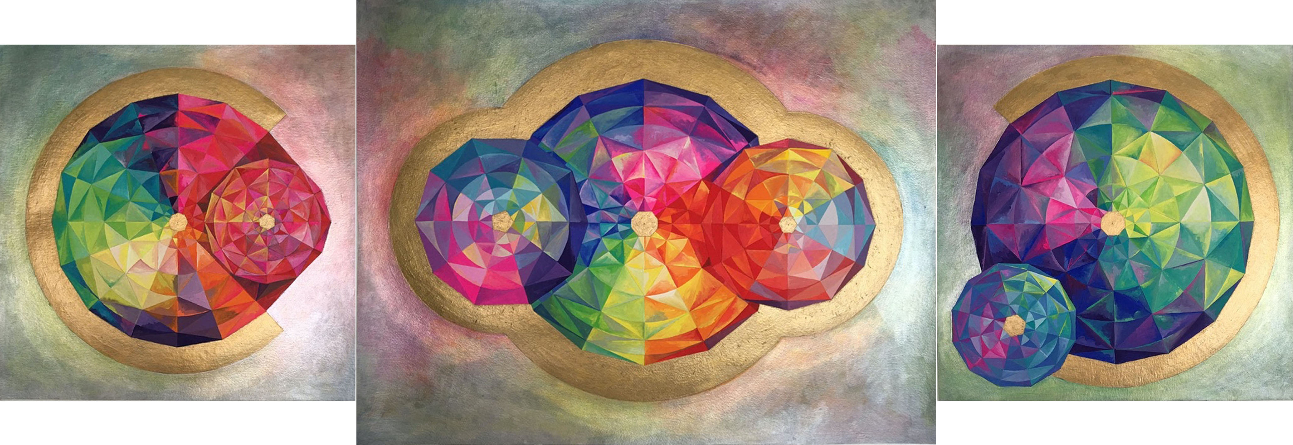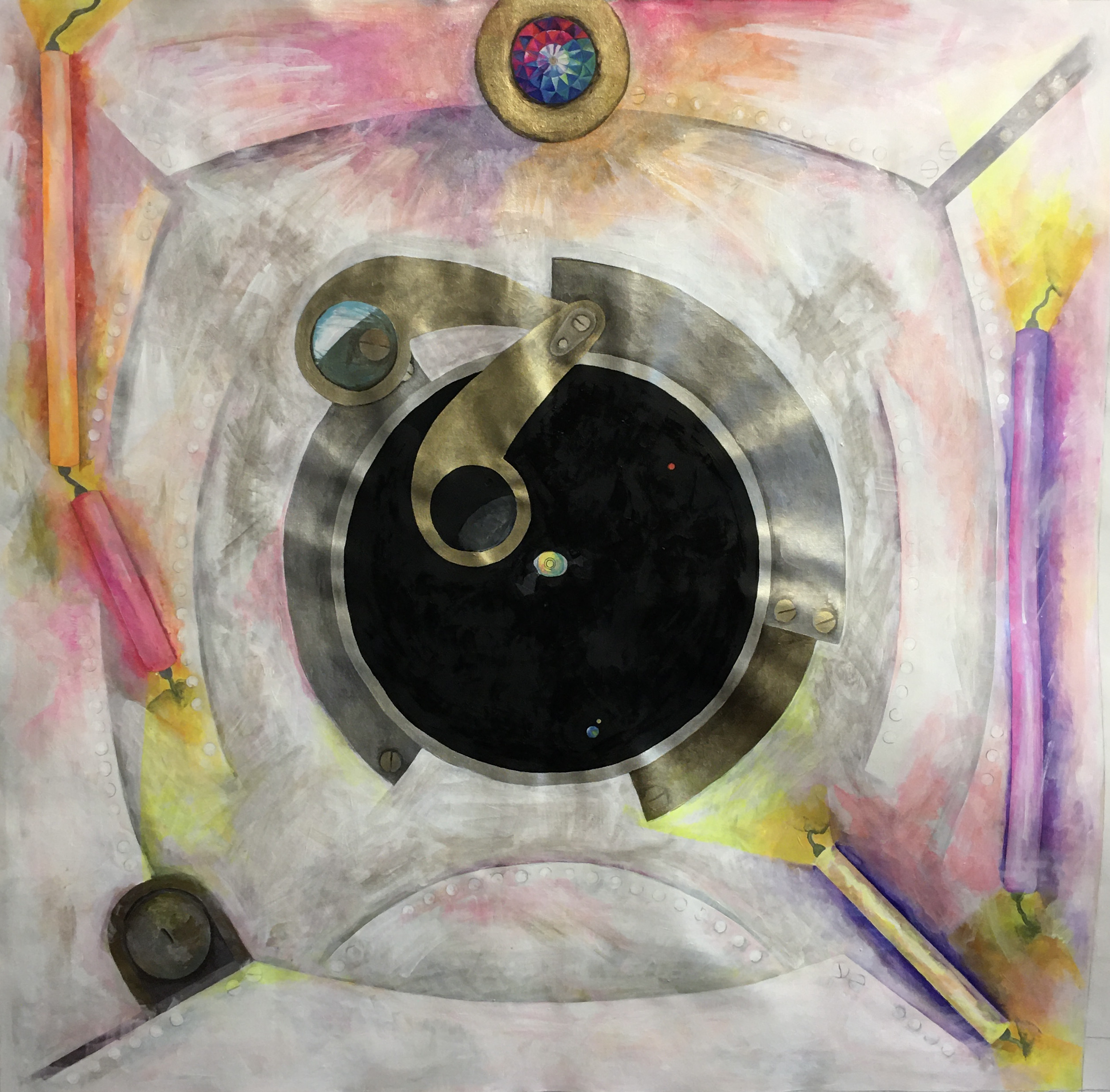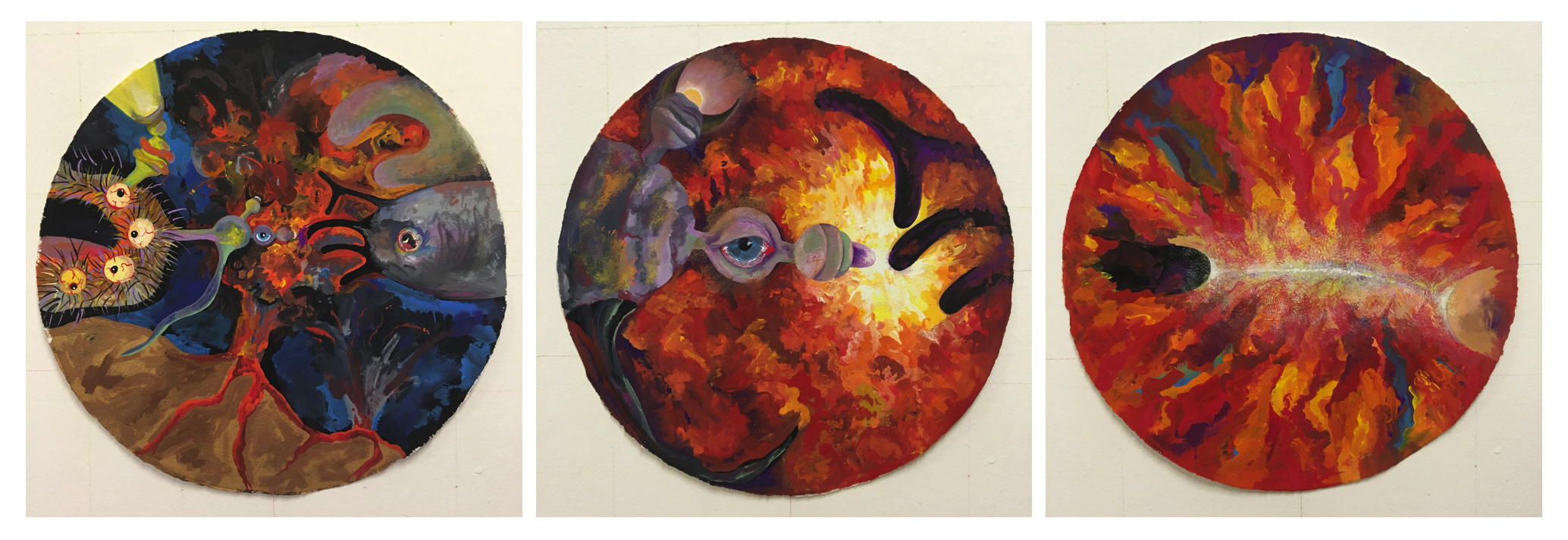 rave na nave 1, 2, 3, guache sobre papel canson, 40 x 40 cm e pintura central 65 x 50 cm